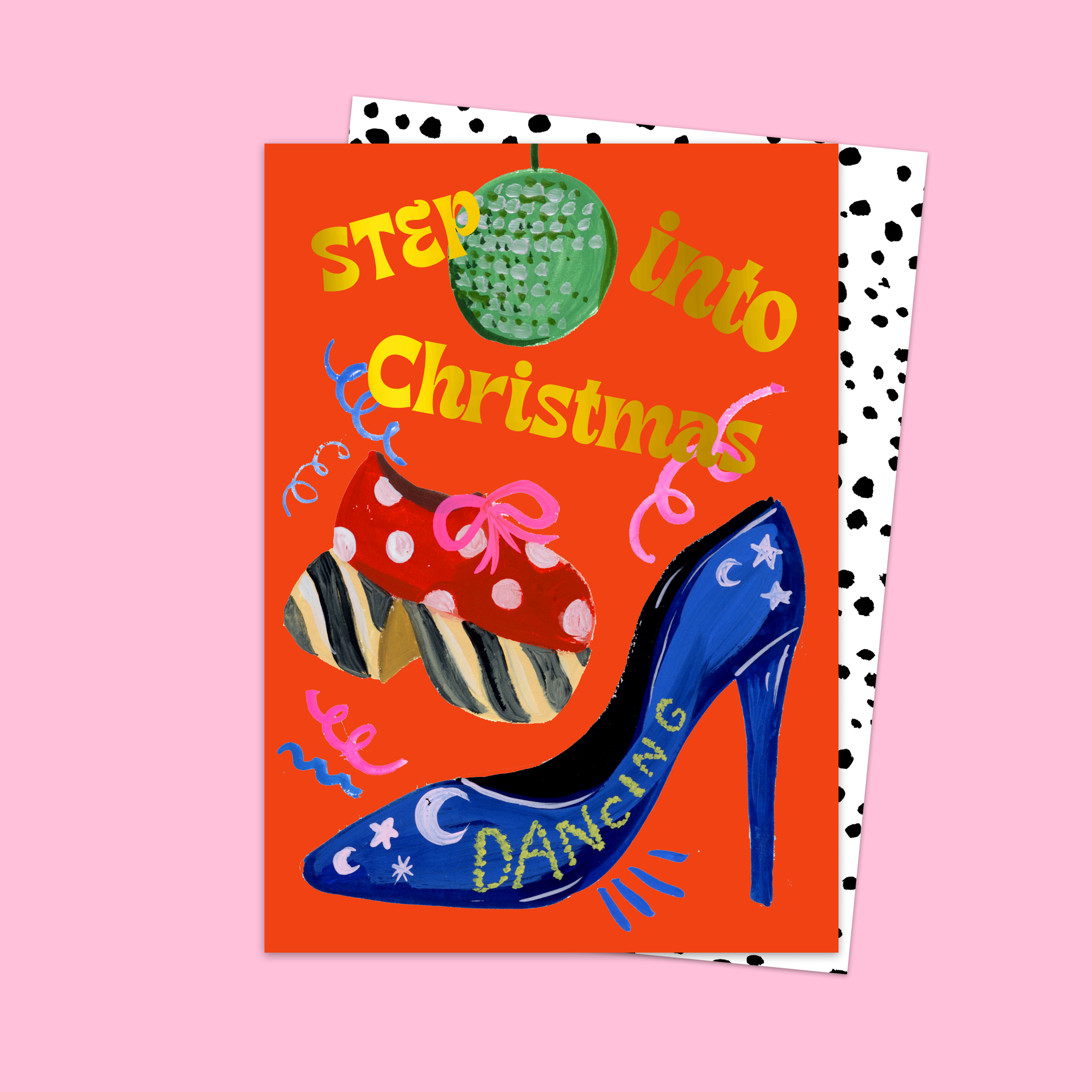 Get your glam on this festive season with our Step Into Christmas Card! Featuring a dazzling stiletto, bold platform shoe, shimmering disco ball, and luxe gold foil lettering. Perfect for spreading disco vibes and sparkling cheer to anyone who loves a bit of festive flair.