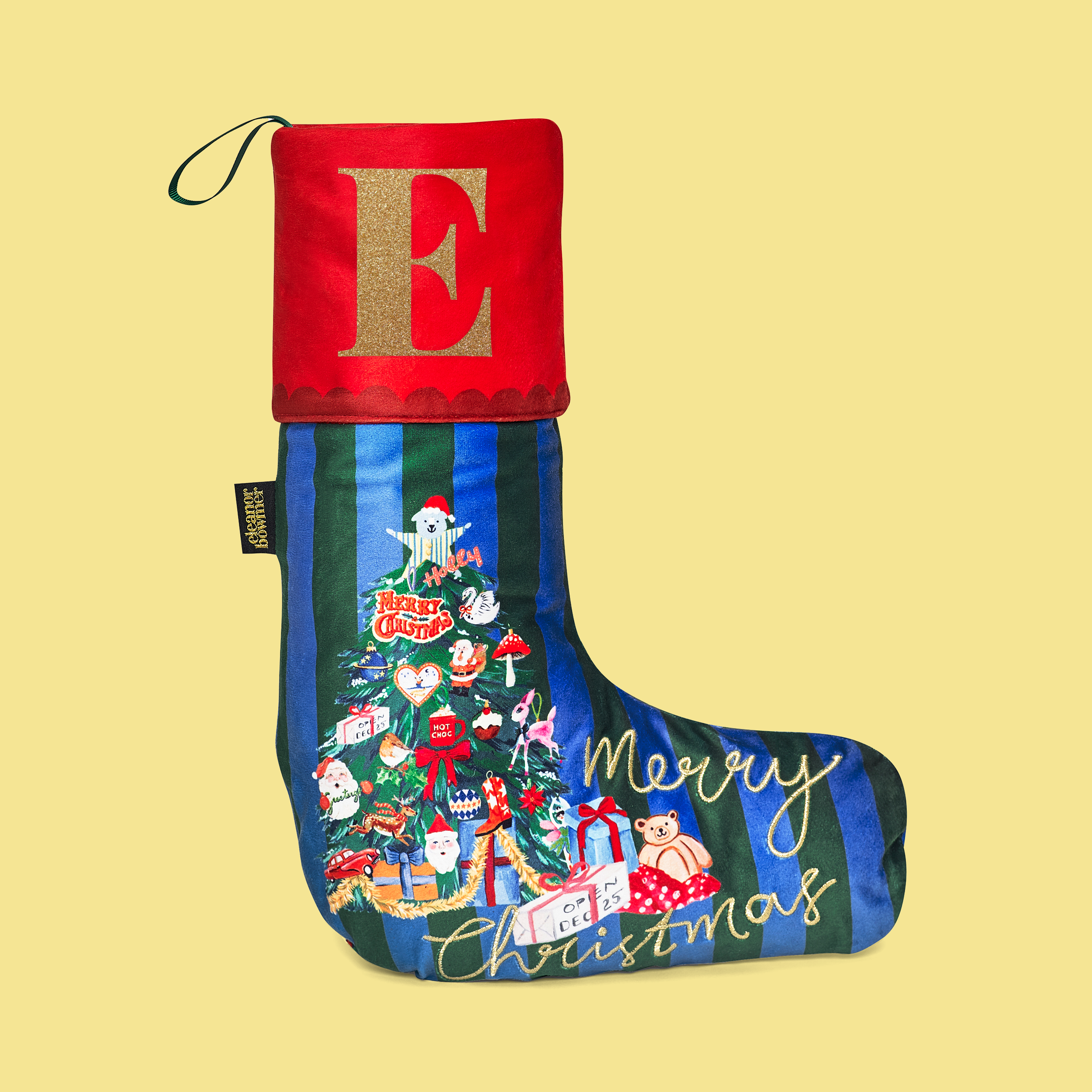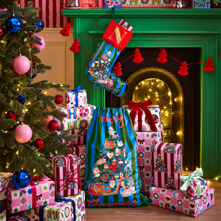 Bringing festive charm with a nostalgic twist, this candy-striped velvet stocking is trimmed with a classic red fold-over cuff with space to add a shiny gold name or initial. A vintage-style Christmas tree decorates the front, with ‘Merry Christmas’ embroidered in gold across the foot. Hot chocolate and matching sack optional - but encouraged! Save even more when you buy the Sack & Stocking Set.