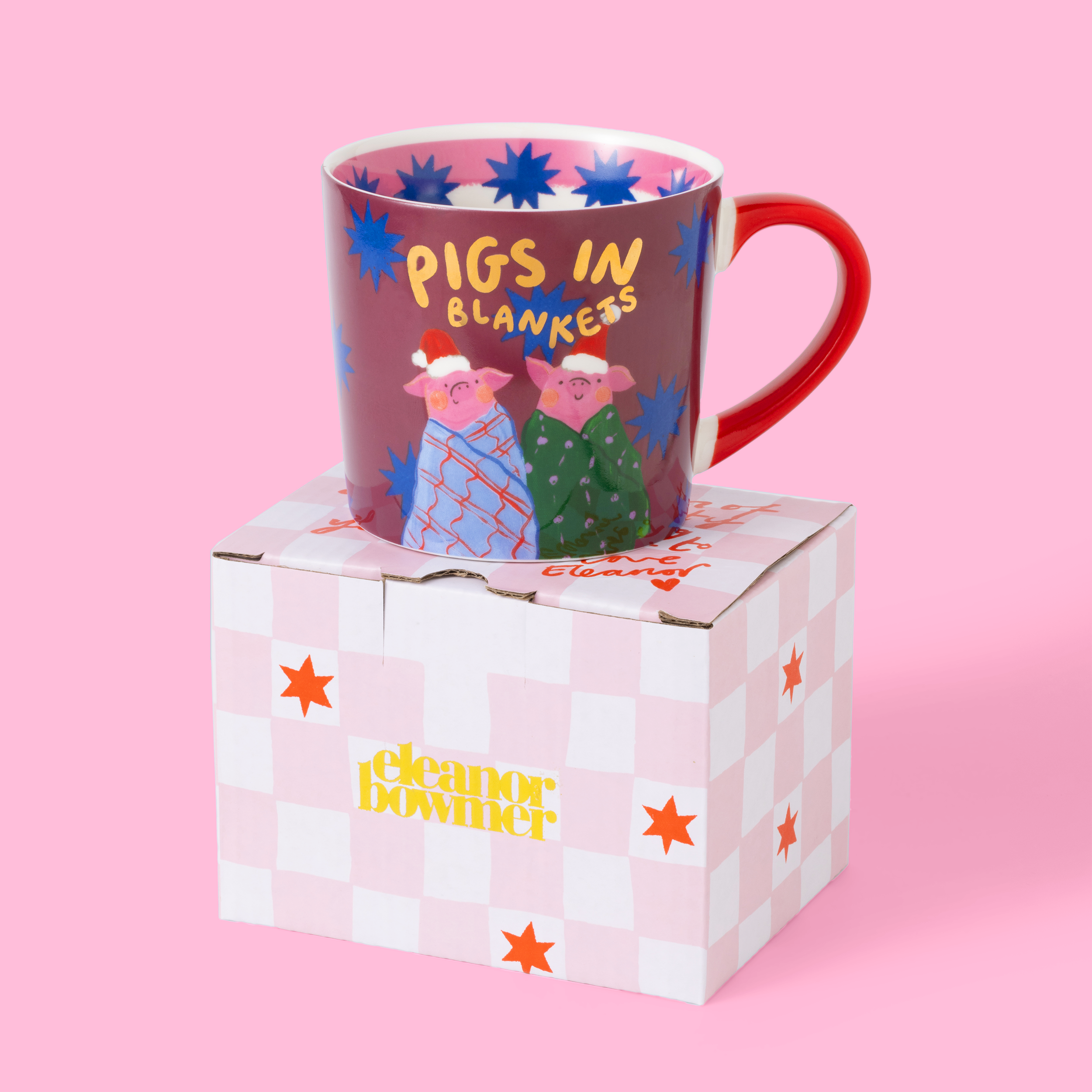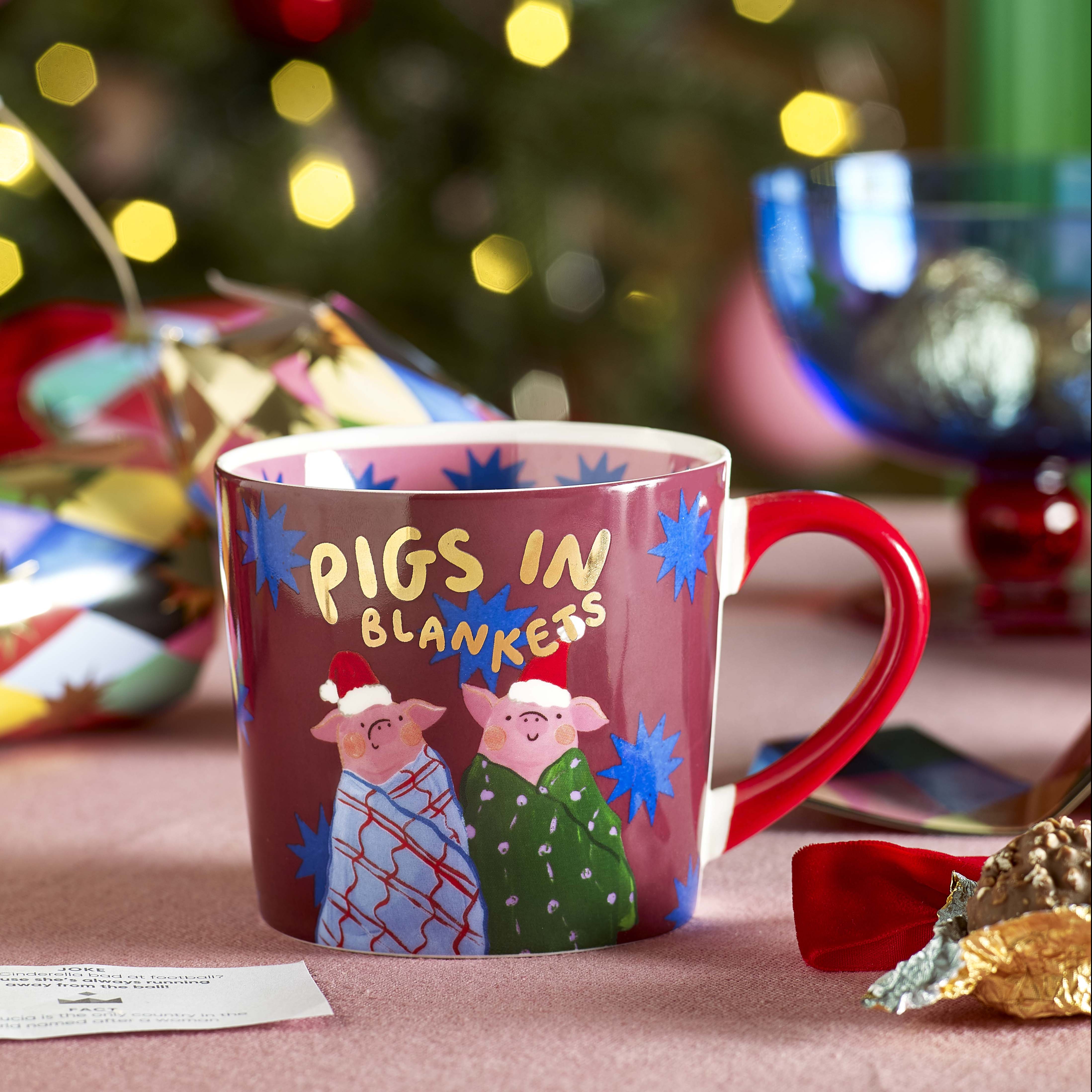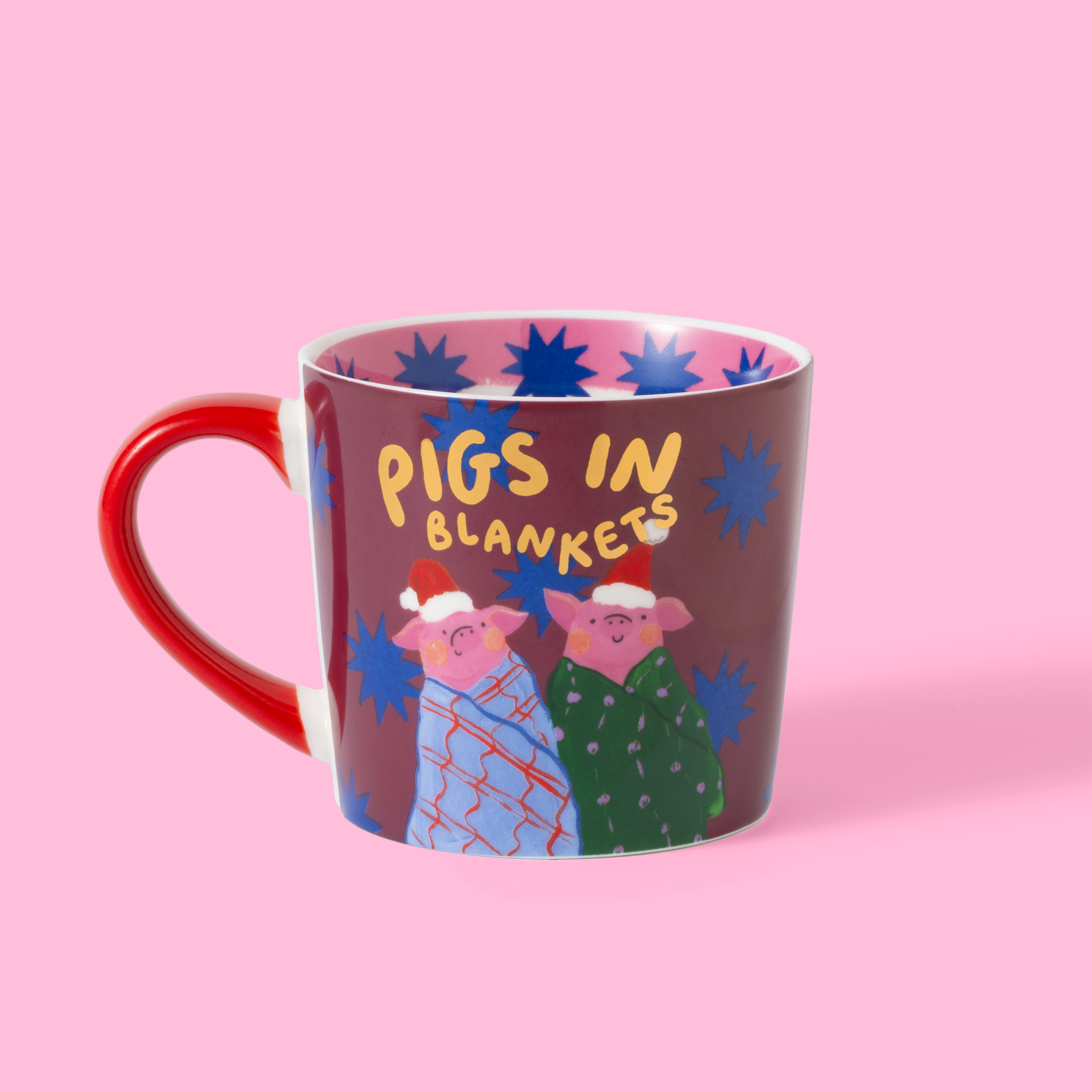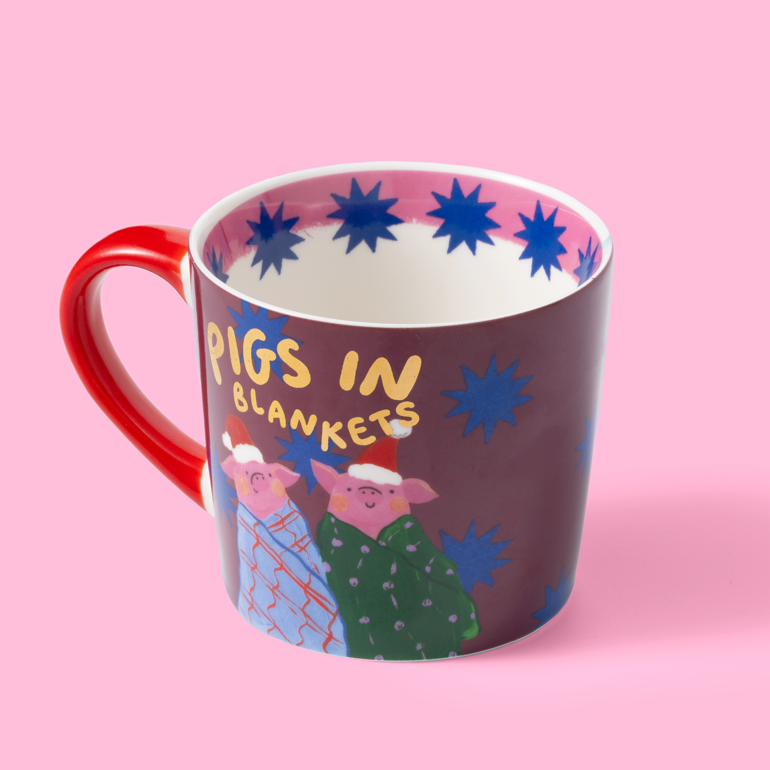 Get cosy this Christmas with the Pigs In Blankets mug. Two snug pigs in Santa hats wrapped up tight, framed by shimmering gold foil lettering and a vibrant red handle. Blue starbursts dance along the rim, making it your perfect festive sidekick for films, hot drinks, and all the snacking.