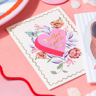 A special card for a special day, this wedding card features a soft pale yellow background, delicate floral illustrations, and a pink and red heart with a gold foil wavey edge and the message "The best is yet to come" in gold foil. The perfect romantic card to celebrate the start of the couple's married life!