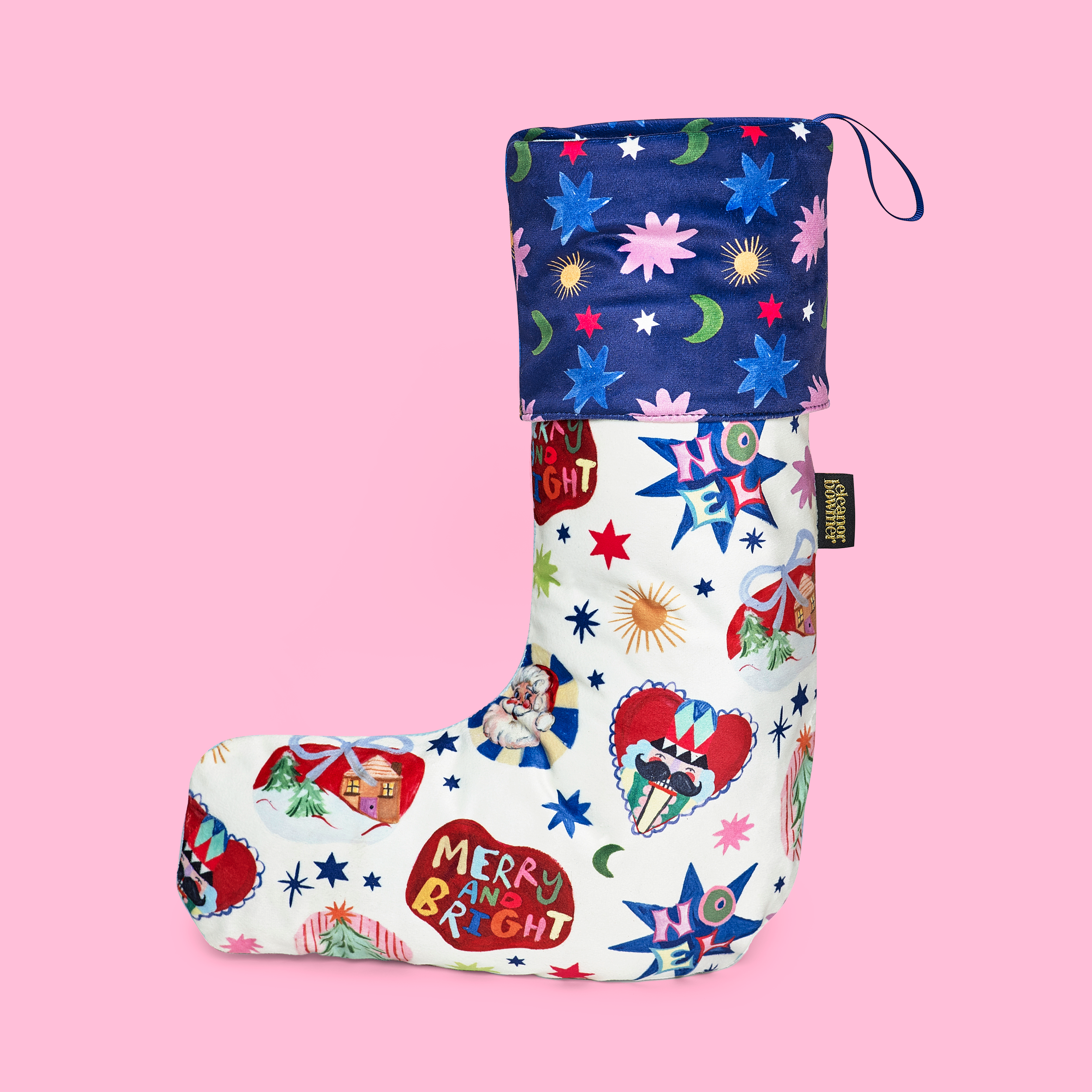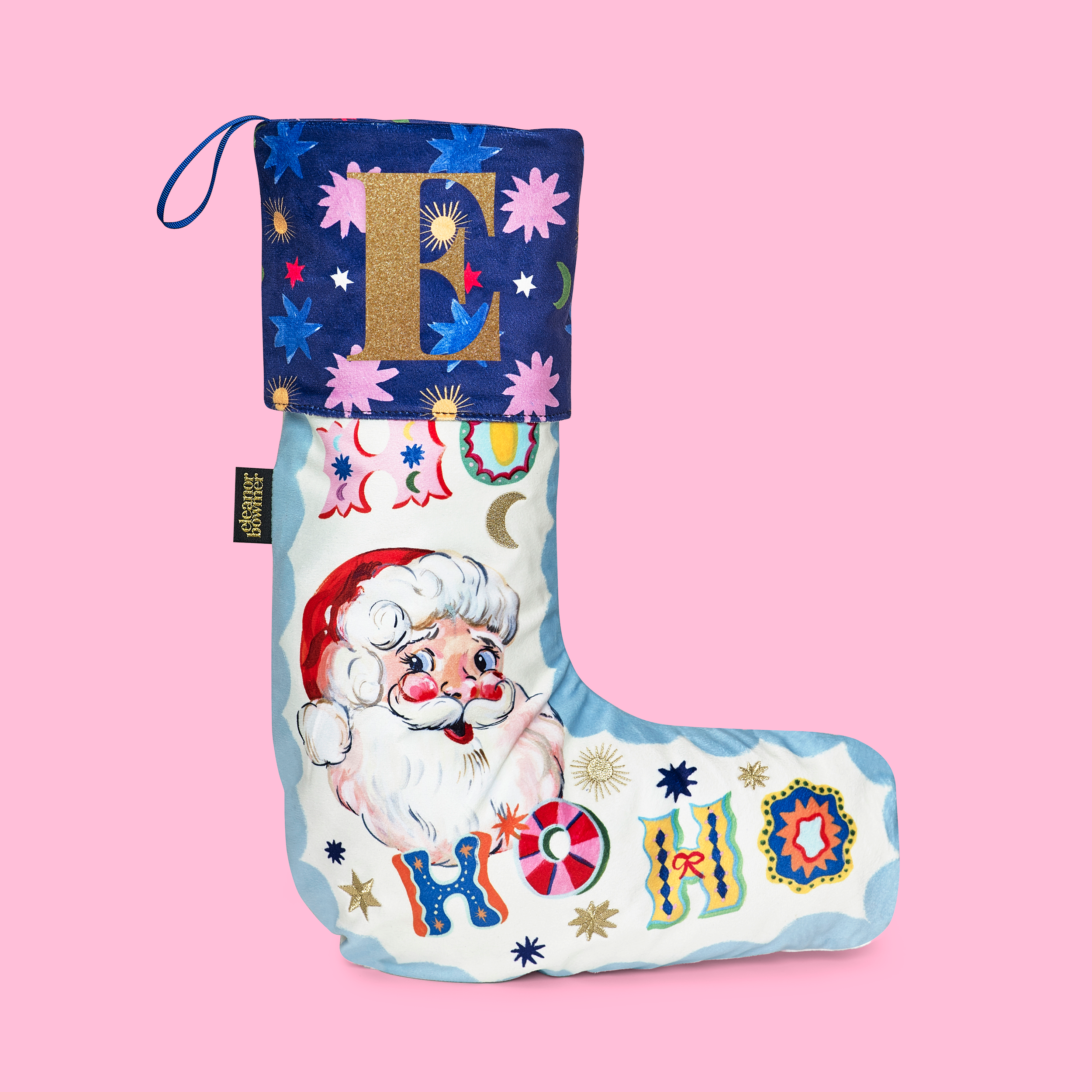 A cheerful classic with a playful twist, the Jolly Santa Velvet Stocking stars Big Nick himself, colourful ‘ho ho ho’ lettering, and a scalloped blue trim. Gold stars are embroidered across the velvet, while the starry night fold-over can be personalised with gold initials or a name. Matching Christmas sack available for the full festive look. Save even more when you buy the Sack & Stocking Set.