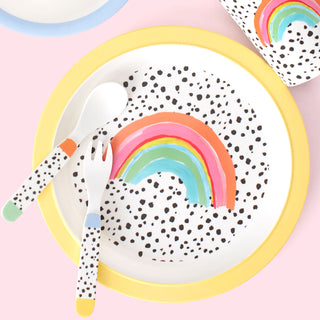 Make mealtime fun with this 5 piece tableware set for kids! It features shatter-resistant melamine for durability and comes with a spoon, fork, plate, bowl and cup, with eye-catching Dalmatian and rainbow illustrations plus yellow and green detail for an extra pop of color.