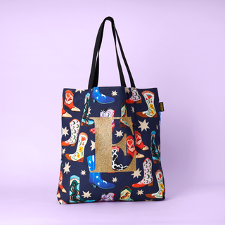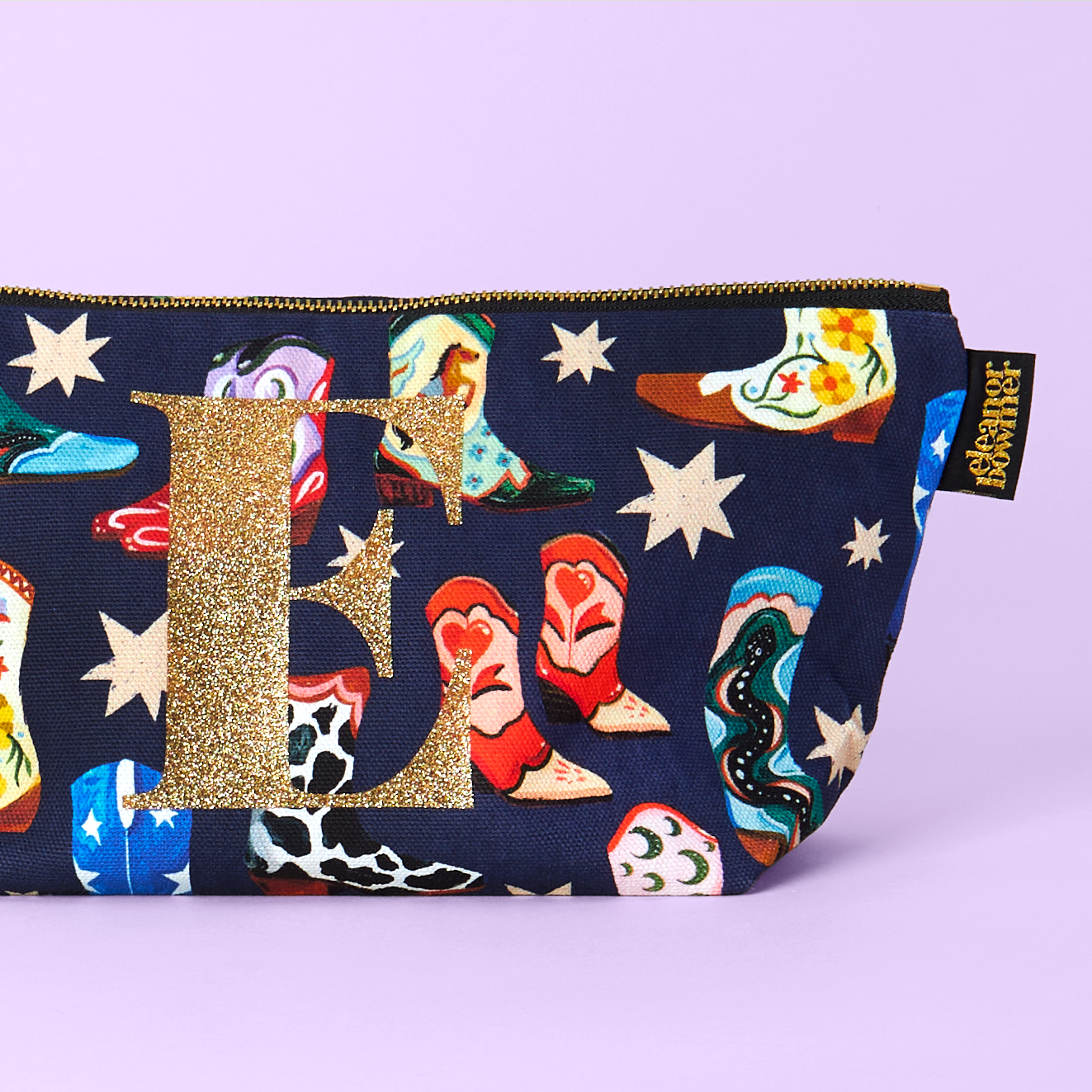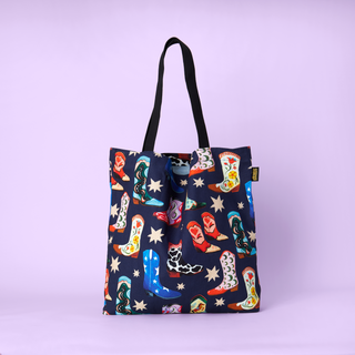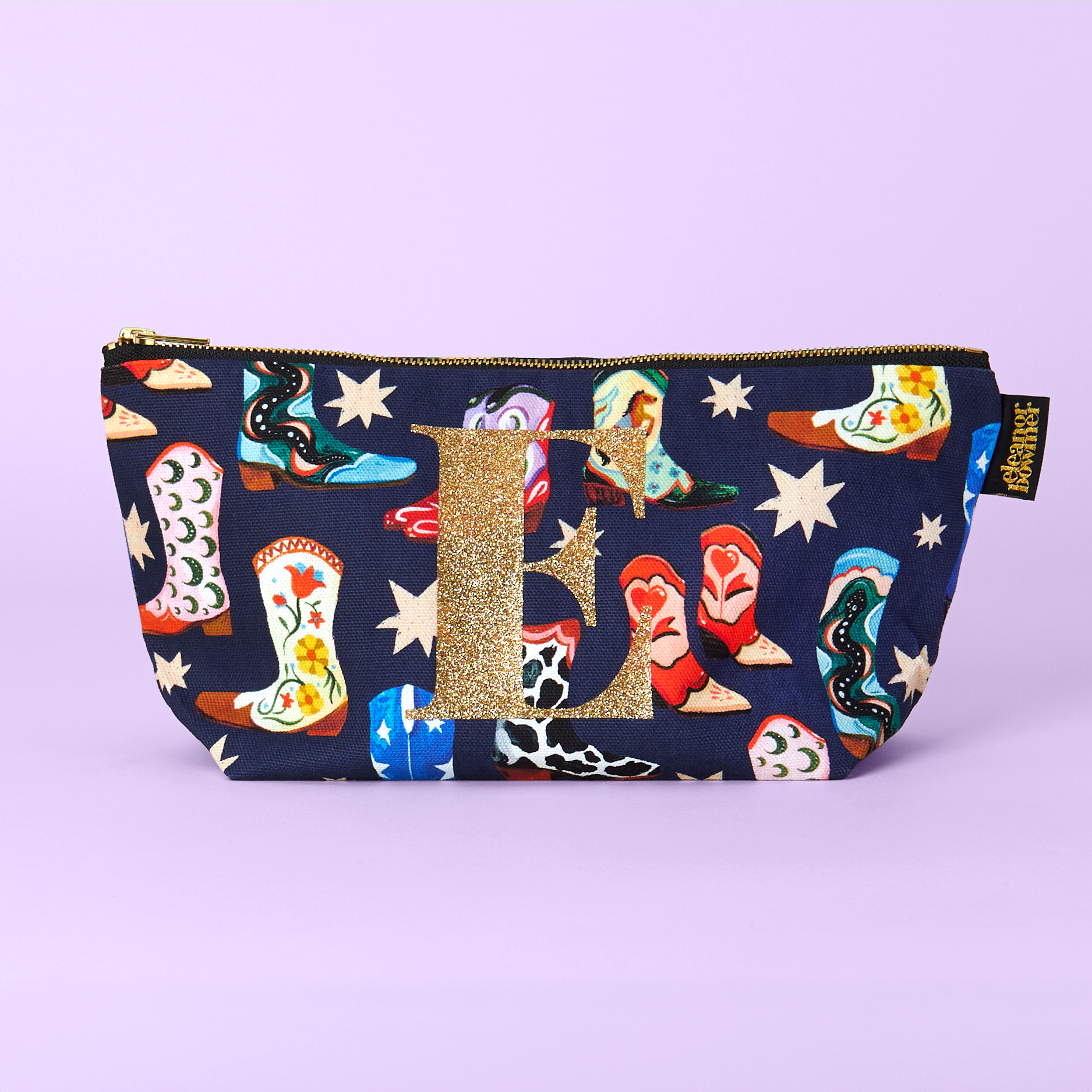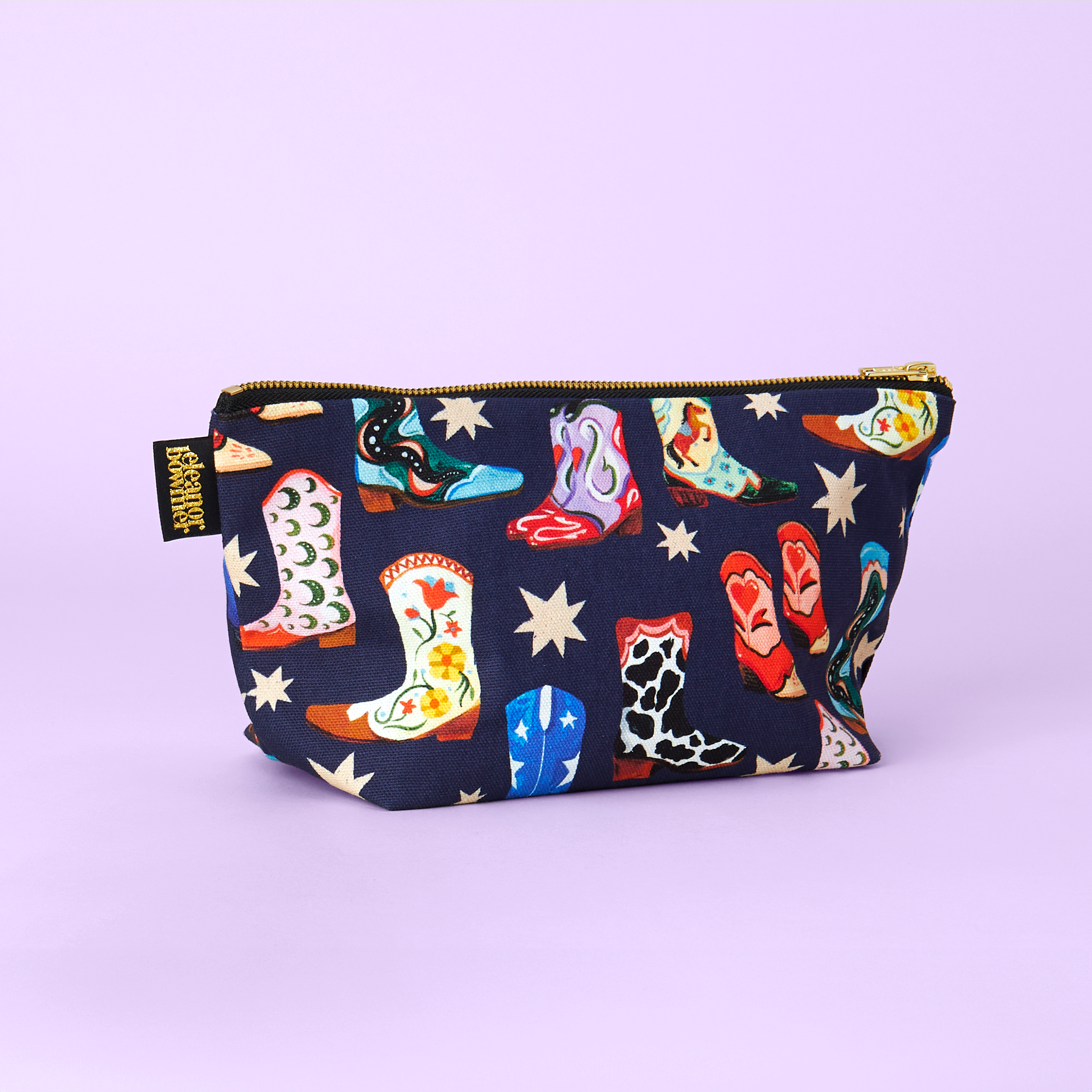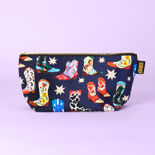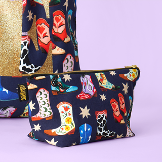 Effortlessly carry your essentials with our Cowboy Boots Zip Bag. The navy colour and wipeable lining make it both stylish and easy to clean. With a unique hand painted design featuring cowboy boots and stars, this zip bag is perfect for using as a makeup bag, wash bag or just to keep your everyday essentials organised.