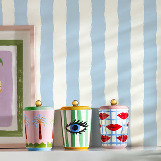 Decorative biscuit tin with cactus and lip designs on a light blue background