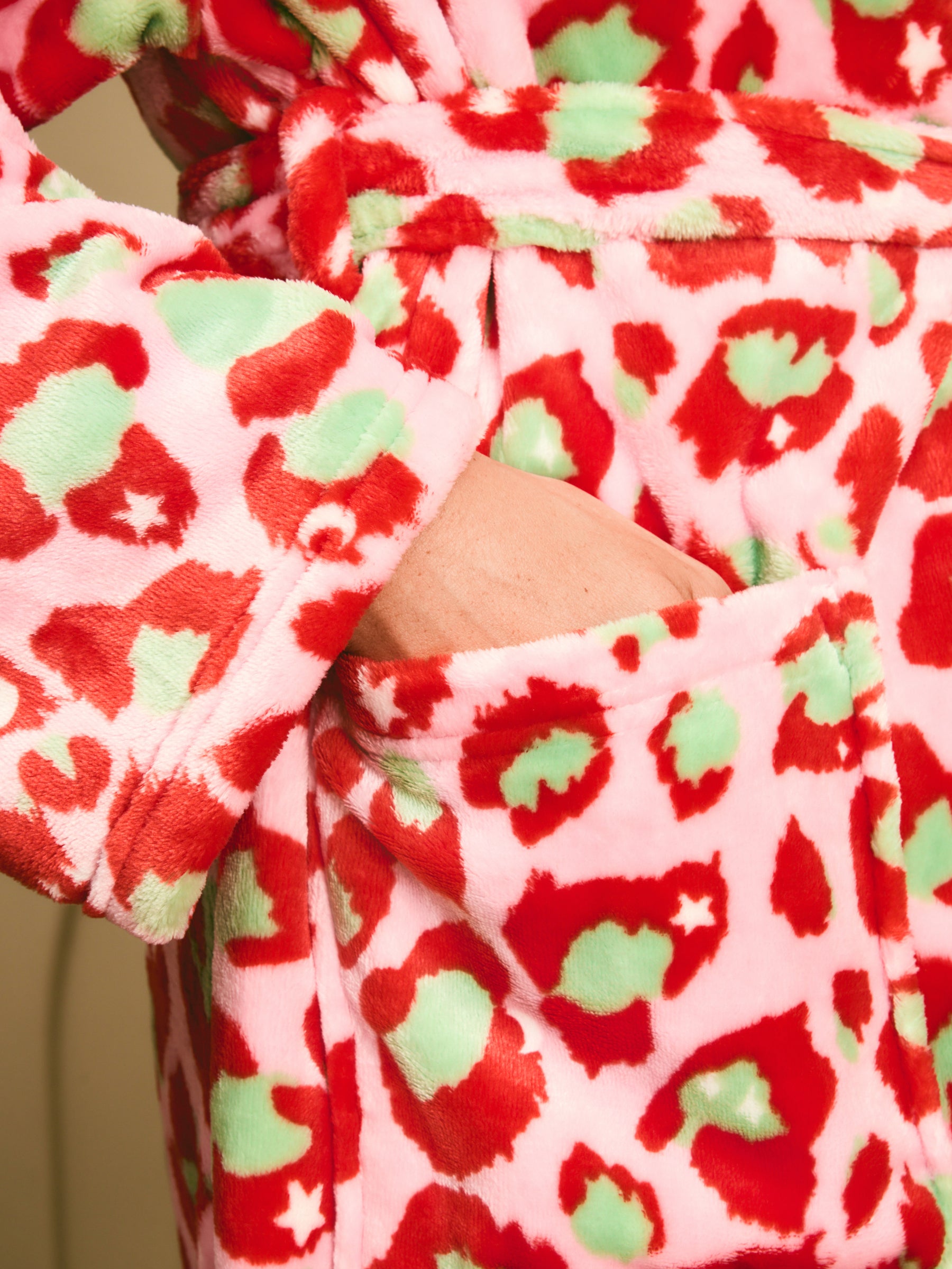 Slip into something unapologetically bold with our Leopard Print Fleece Robe. Bright red and green spots on soft pink fleece, plus a cosy hood for maximum snug vibes. Made for morning coffee, mid-afternoon chill, or whenever you need a bit of fun and warmth. It’s loud, proud, and totally you - because comfy should never be boring.