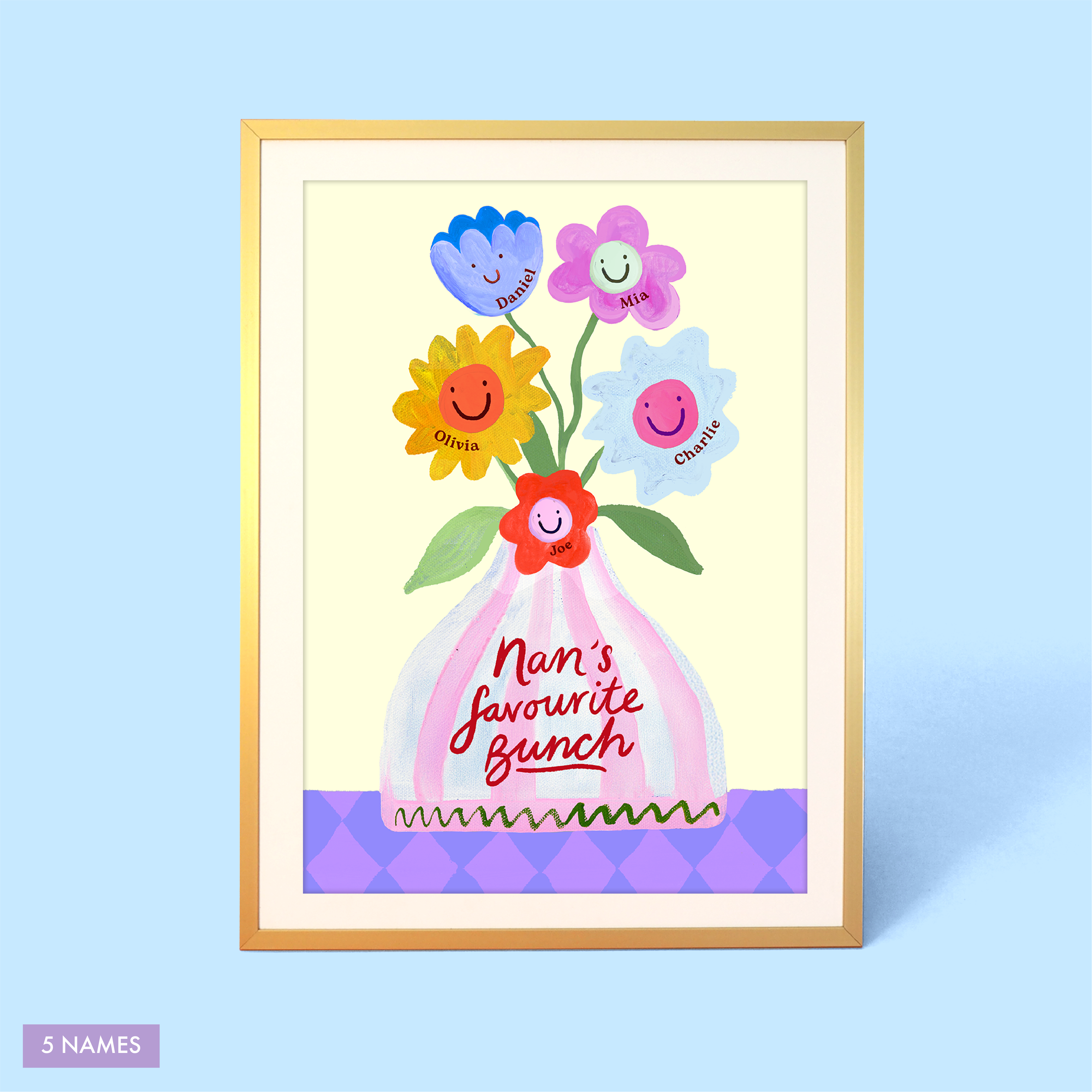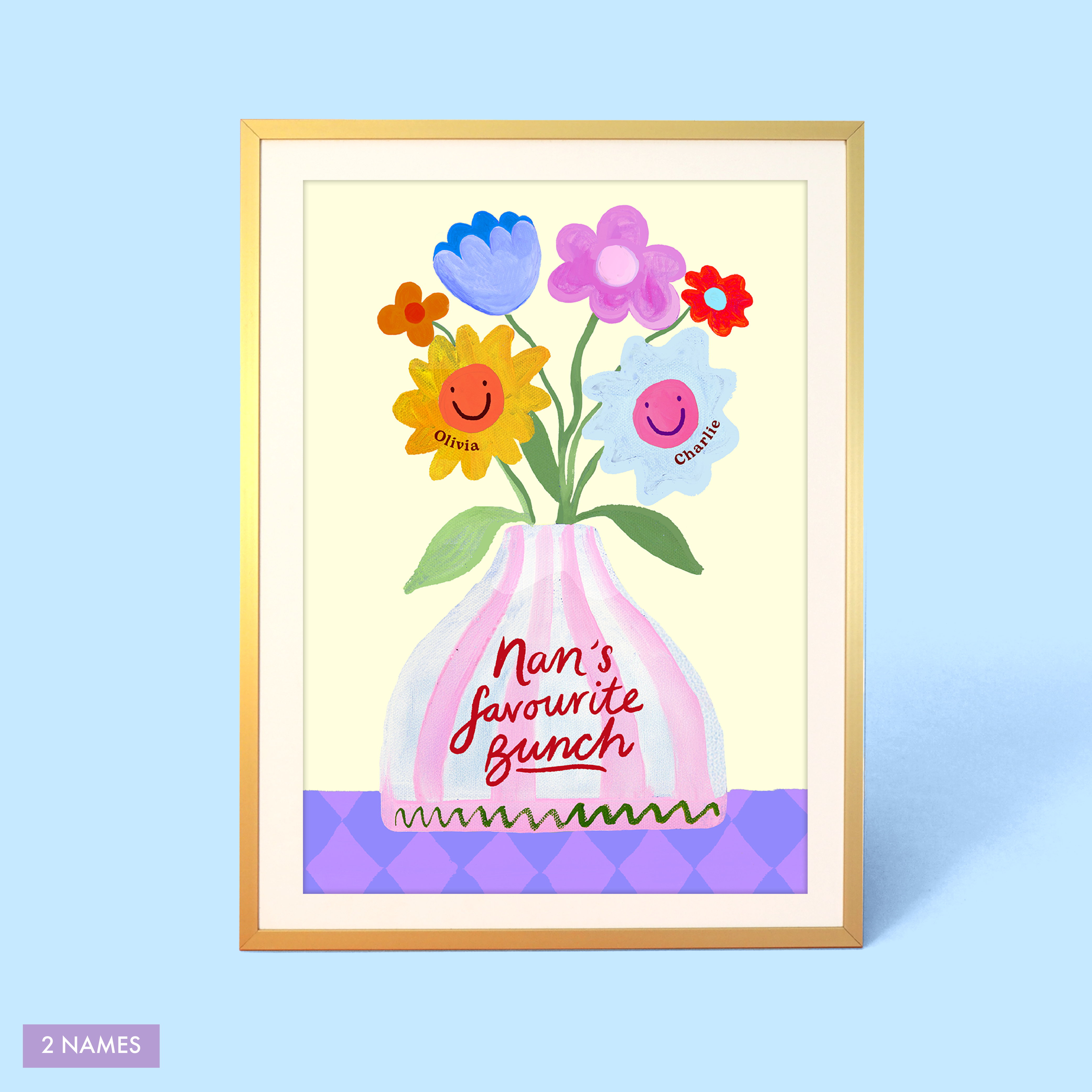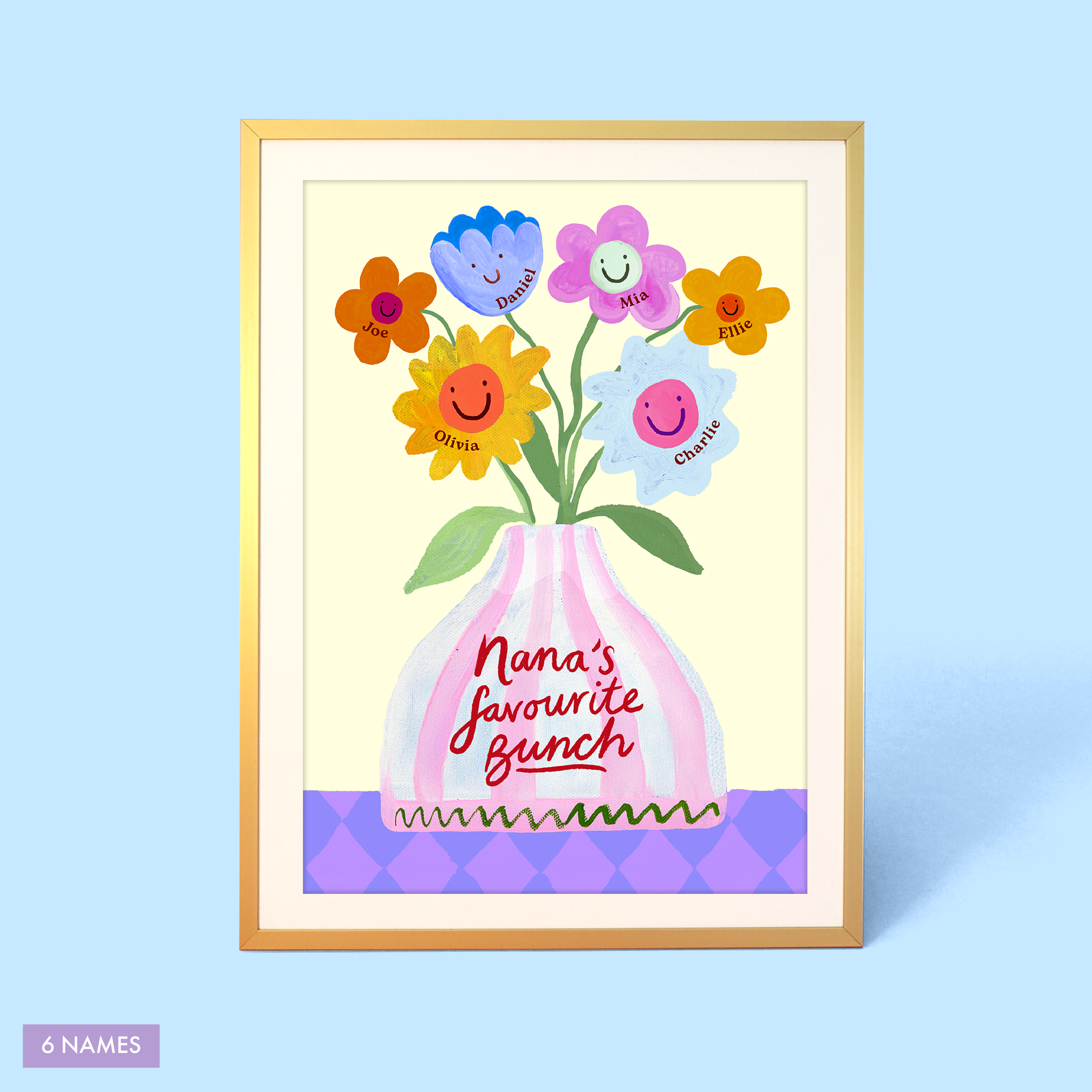 Brighten her day with Nan’s Favourite Bunch Vase Print – a joyful celebration of family love. A vase overflowing with blooms, each one a reminder of the grandchildren who make her heart full. Choose from Nan or Nana on the vase and personalise the flowers with up to six names to create a keepsake that feels warm, thoughtful and bursting with happiness. A feel-good gift she’ll treasure every day.