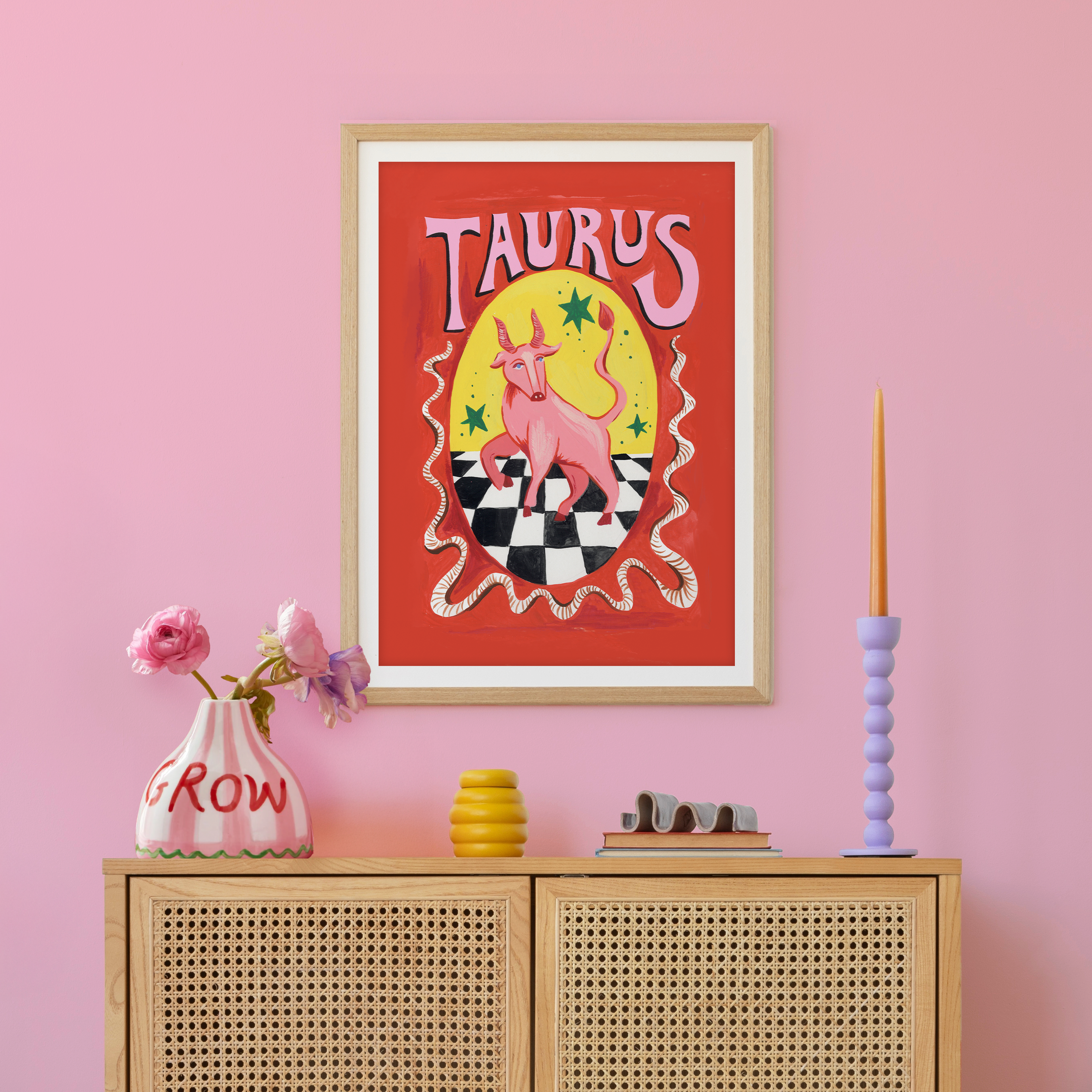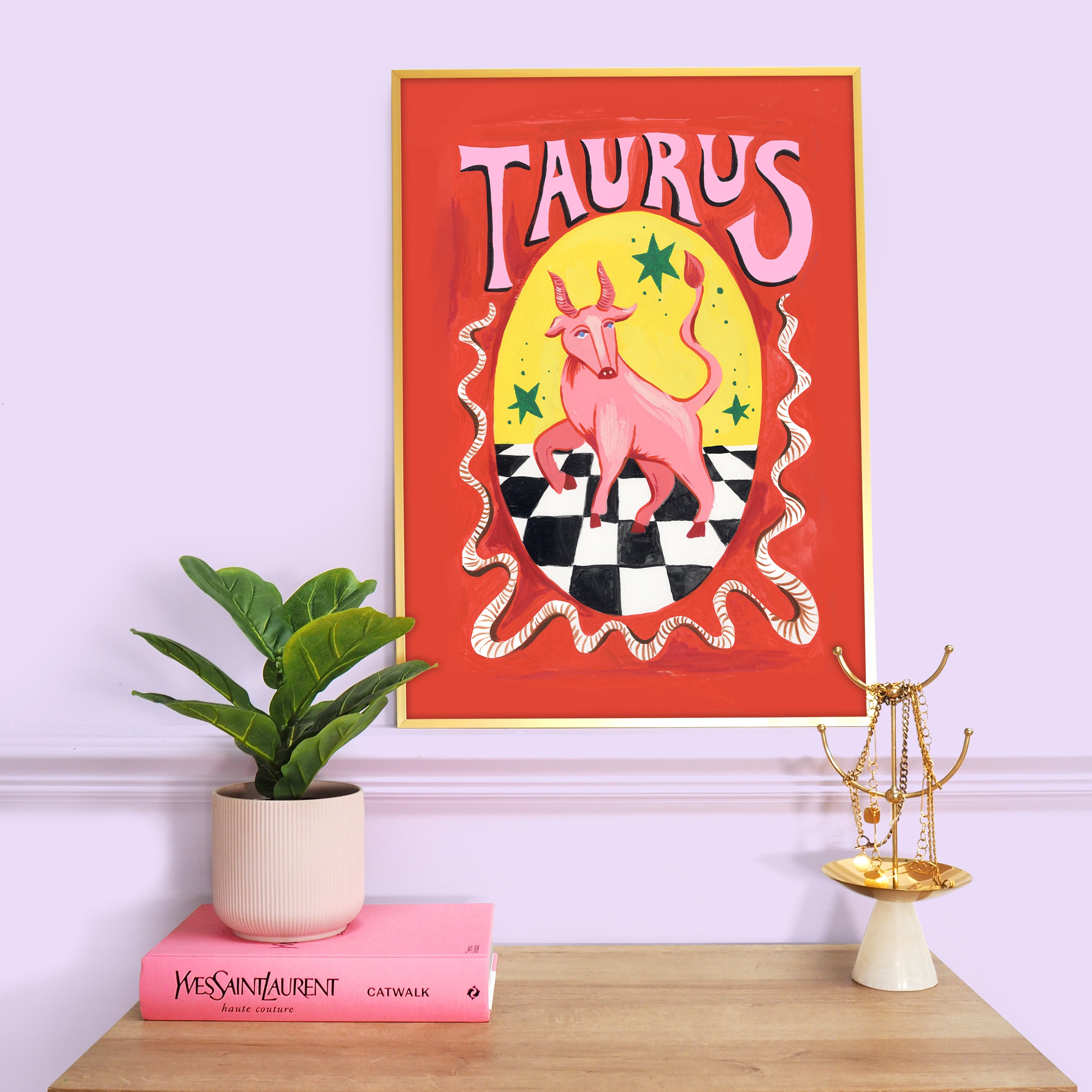 This striking print would make a wonderful wall art for that special Taurus in your life! The Taurus Zodiac Print features bold hand painted symbols and elements of the Taurus star sign. This includes the Bull, star constellation, fire and the sun.