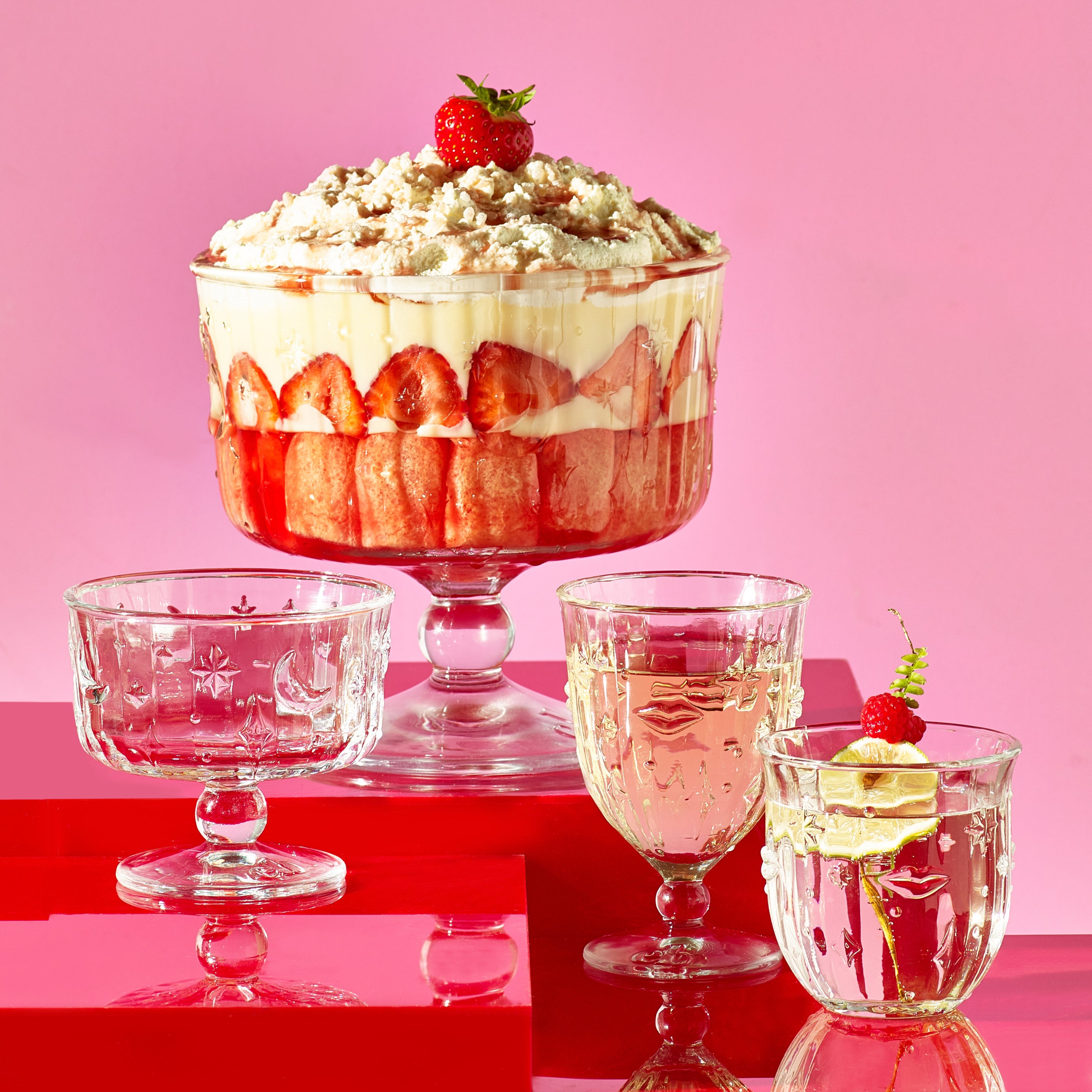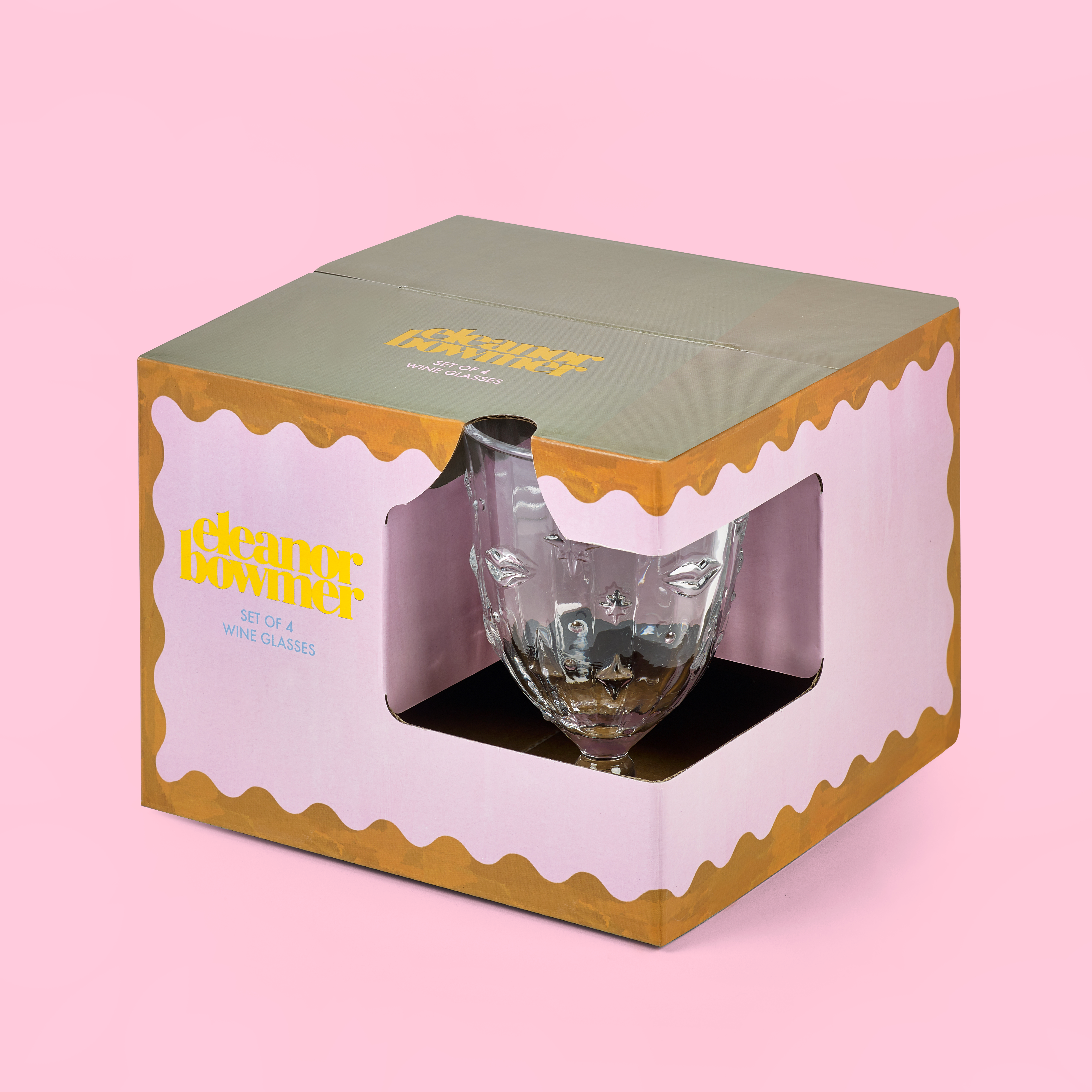These clear, embossed glass wine glasses come in a set of 4, perfect for sharing a toast with your special someone. Pair with our matching tableware and enjoy sipping from these pretty, short-stemmed glasses.