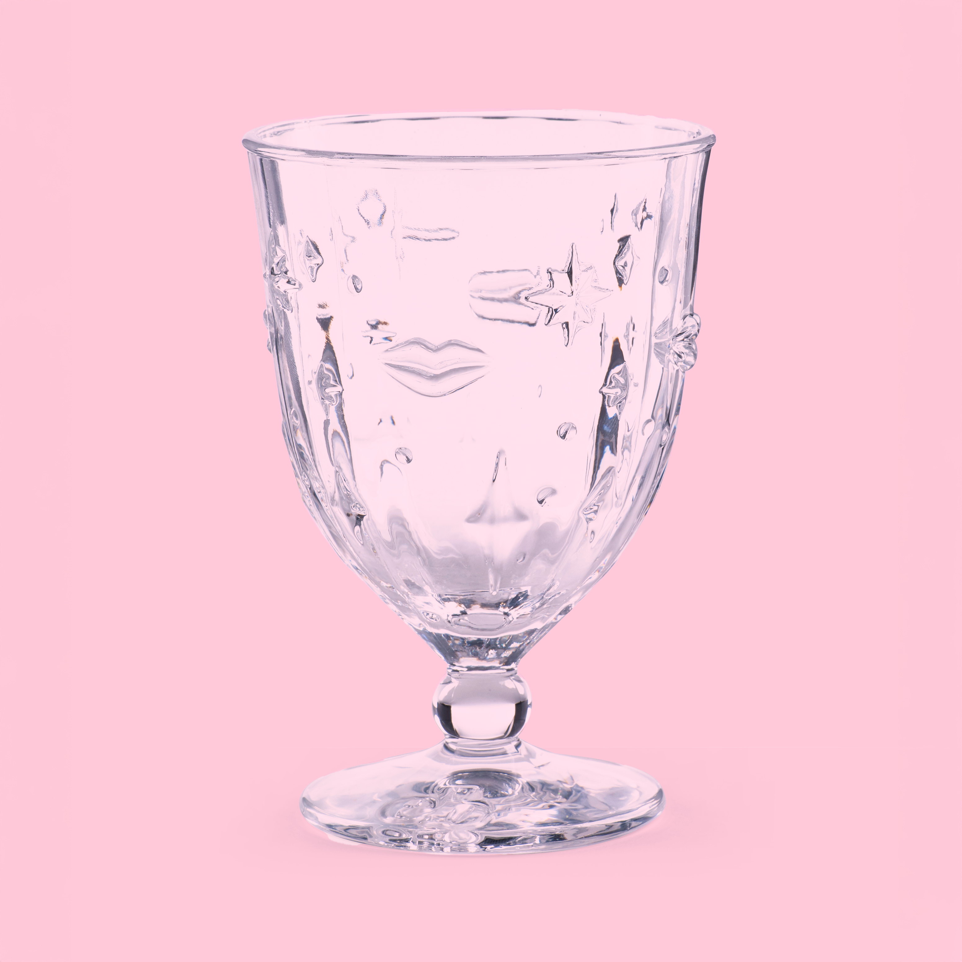 Made from clear glass, each wine glass is made with the pressed glass technique featuring stars and lips.