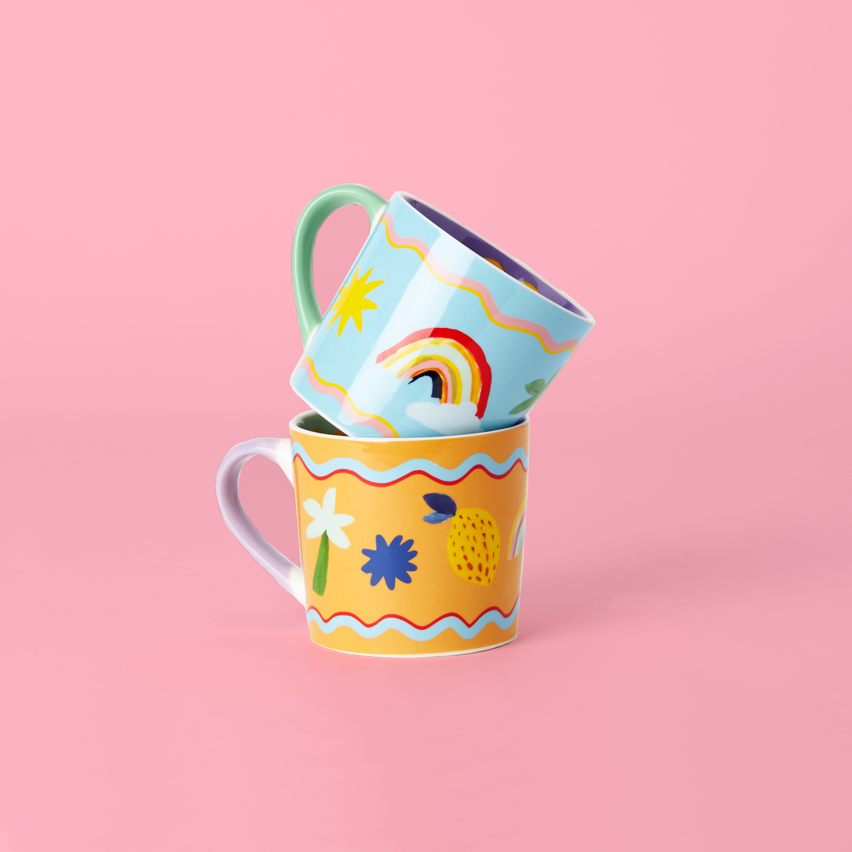 Show someone special how much you care with our Teddy Bear Love You Mugs - a set of 2 mugs perfect for your other half, bestie, or parents. Each mug features a cute illustrated design with bears and tropical patterns, and a rainbow wavey design inside. The blue mug features the message 'Love you' across the front and the orange says 'Love you too', making them a sweet and colourful addition to any kitchen.