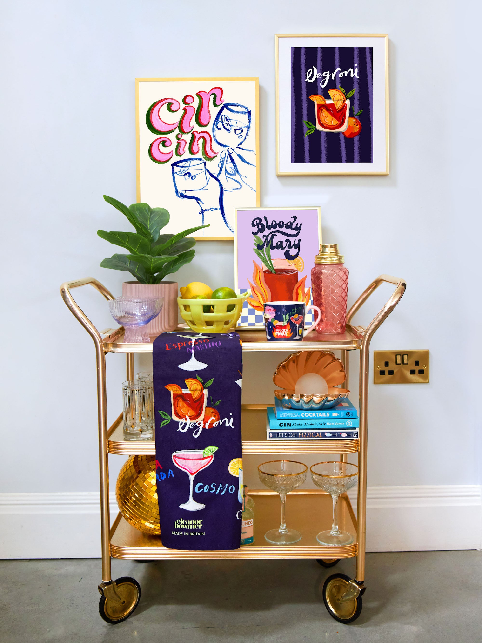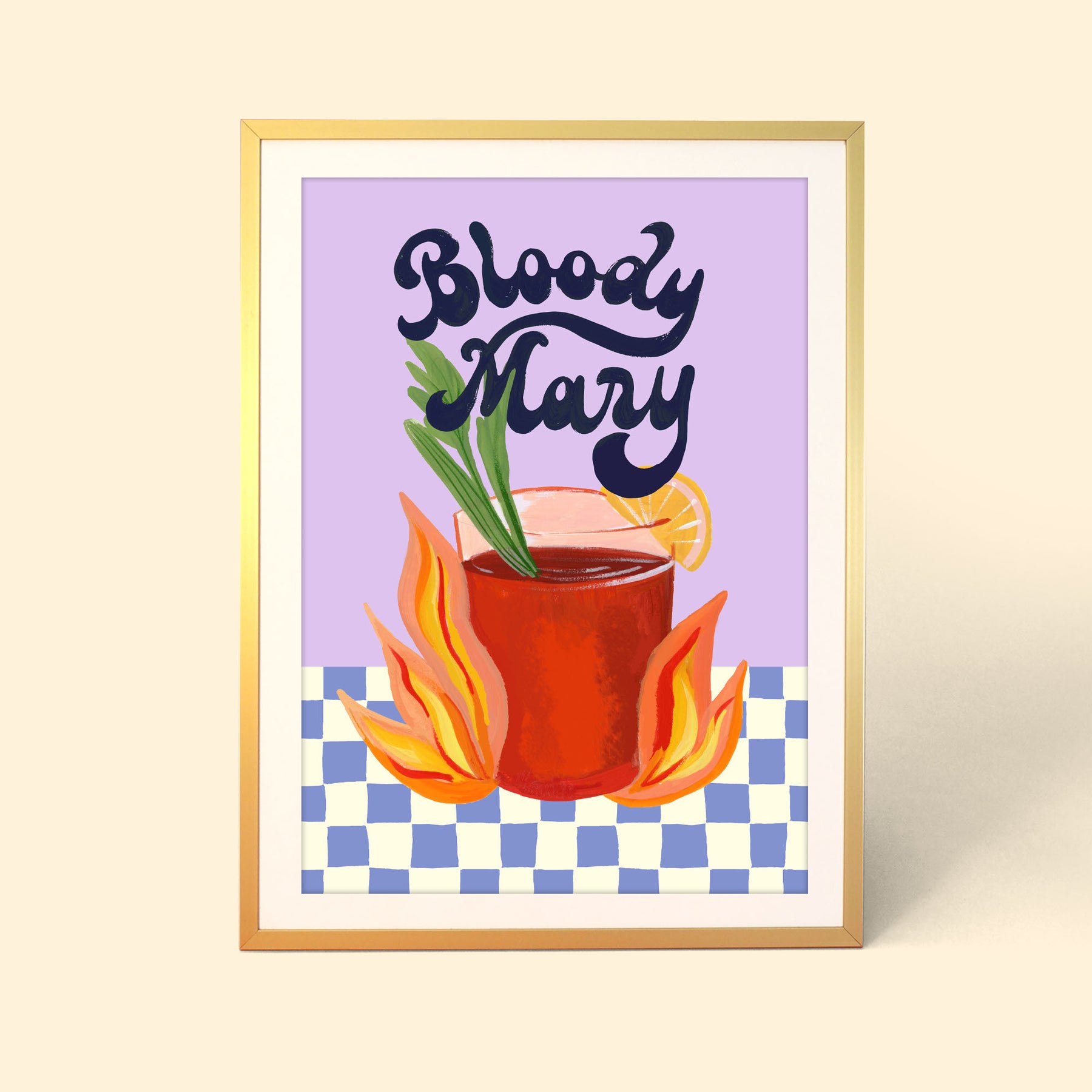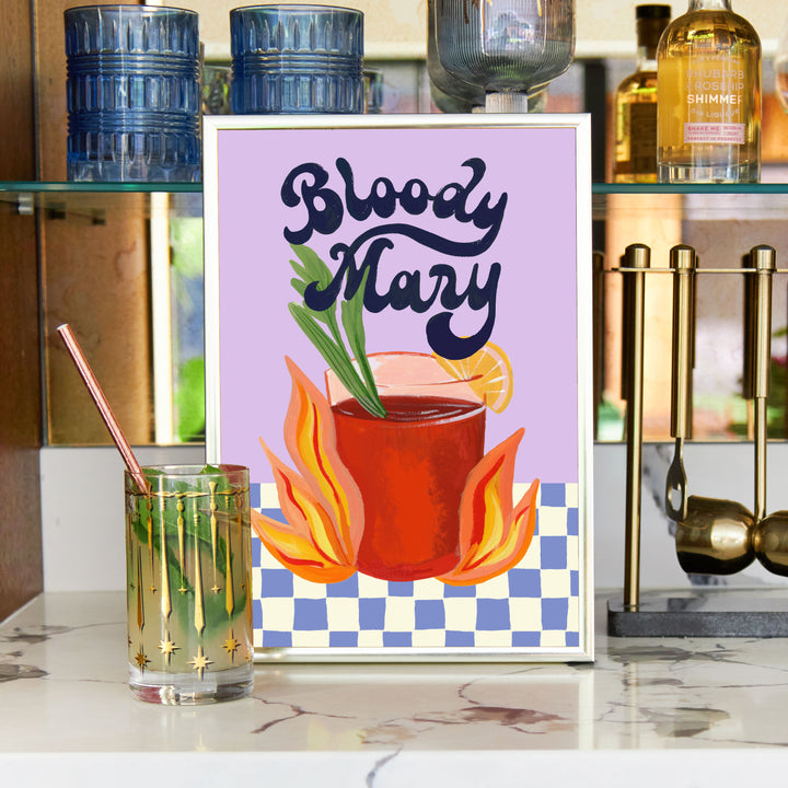 Brighten up your kitchen with our Bloody Mary Cocktail Print! This fiery and colourful print features a Bloody Mary cocktail in the centre of a pale blue checkerboard pattern, set against a lilac background. Perfect for any cocktail-loving home!