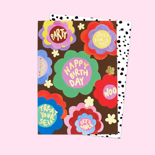 Make someone's special day extra special with a Bold Floral Birthday Card. This fun card features a beautiful retro floral design and a brown background, complete with lovely messages of birthday wishes on the flowers. Gold foil flowers perfectly complete the look!
