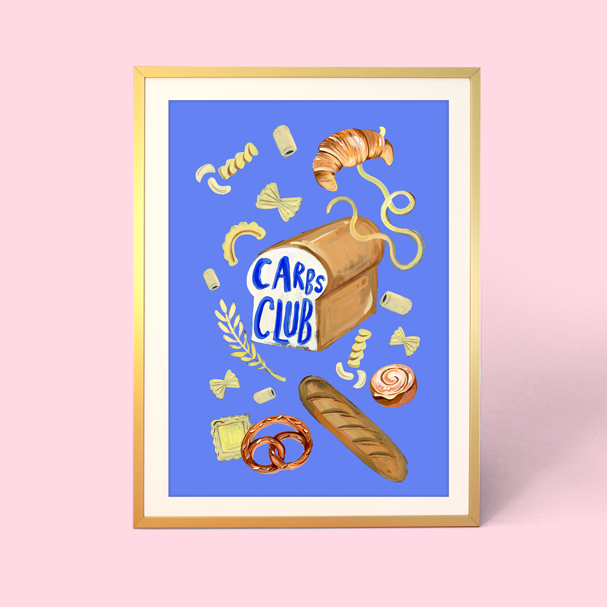 Welcome to the Carbs Club, in print form. With a bright blue background and a line-up of delicious pasta and breads, this playful piece brings big foodie energy to your walls. Carb-loving to the core? Pair it with the matching tea towel for the full feast.