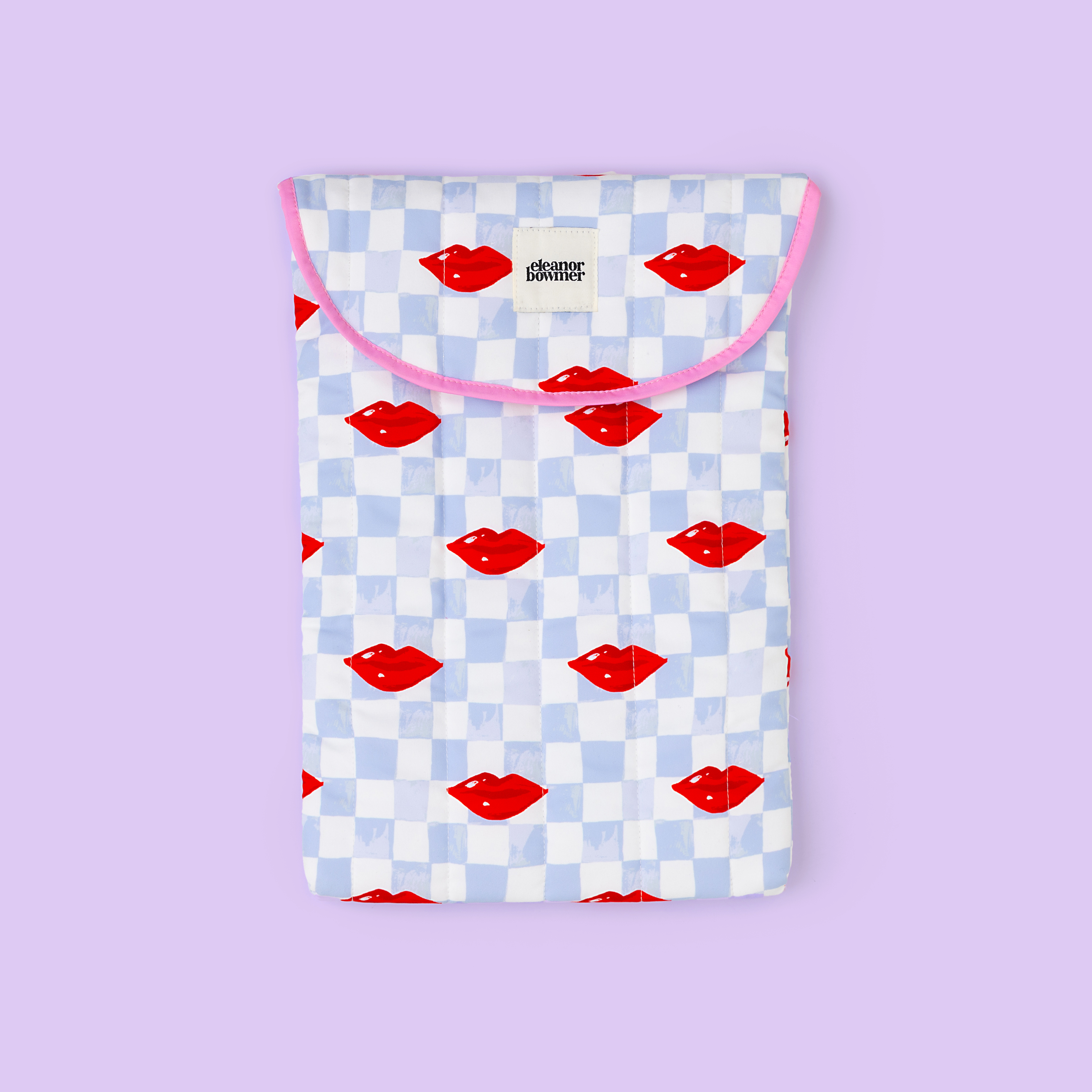 Protect your laptop in style with our Checkerboard Lips Laptop Case. Featuring a playful blue-and-white checkerboard pattern with red lips and a vibrant pink-and-red wavy striped lining, it’s the perfect blend of fun and function. Padded and snug, it pairs beautifully with the matching pencil case for flawless coordination.