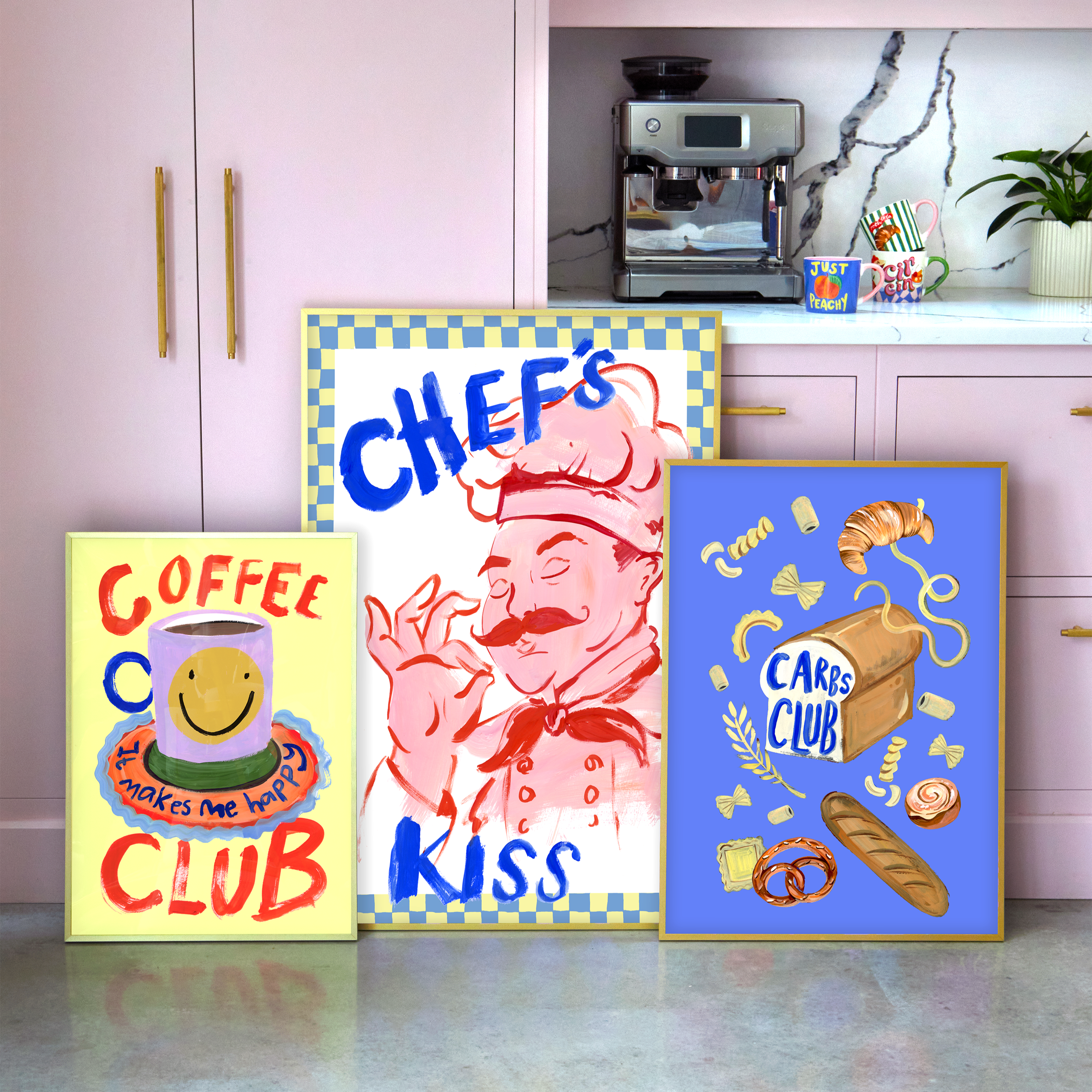 Add a touch of fun to your kitchen with our Chef's Kiss Print. Featuring an illustrated chef surrounded by a blue and yellow checkerboard border, and the words 'Chef's Kiss' in bold blue lettering. The perfect kitchen art print for any budding chef!