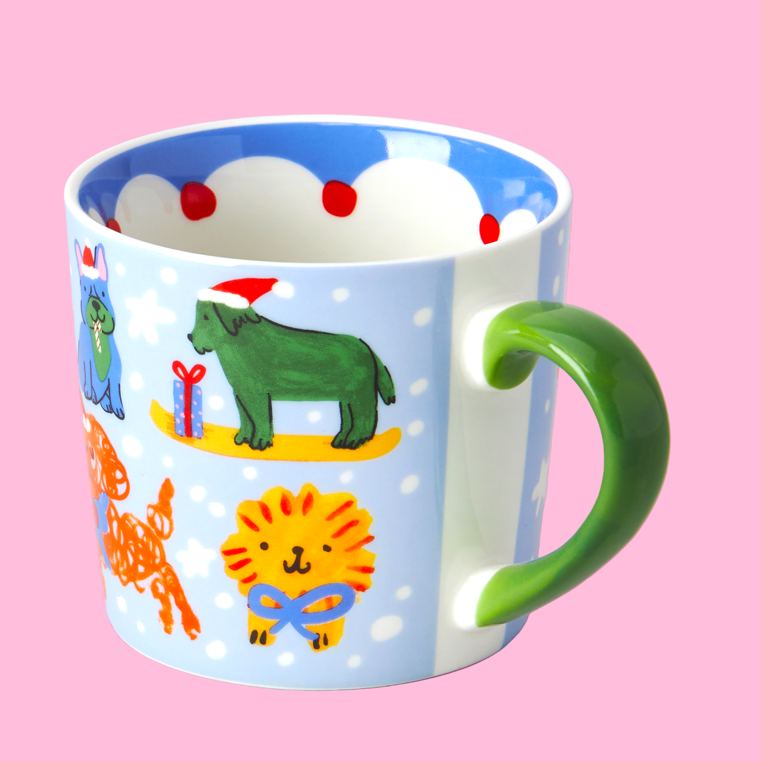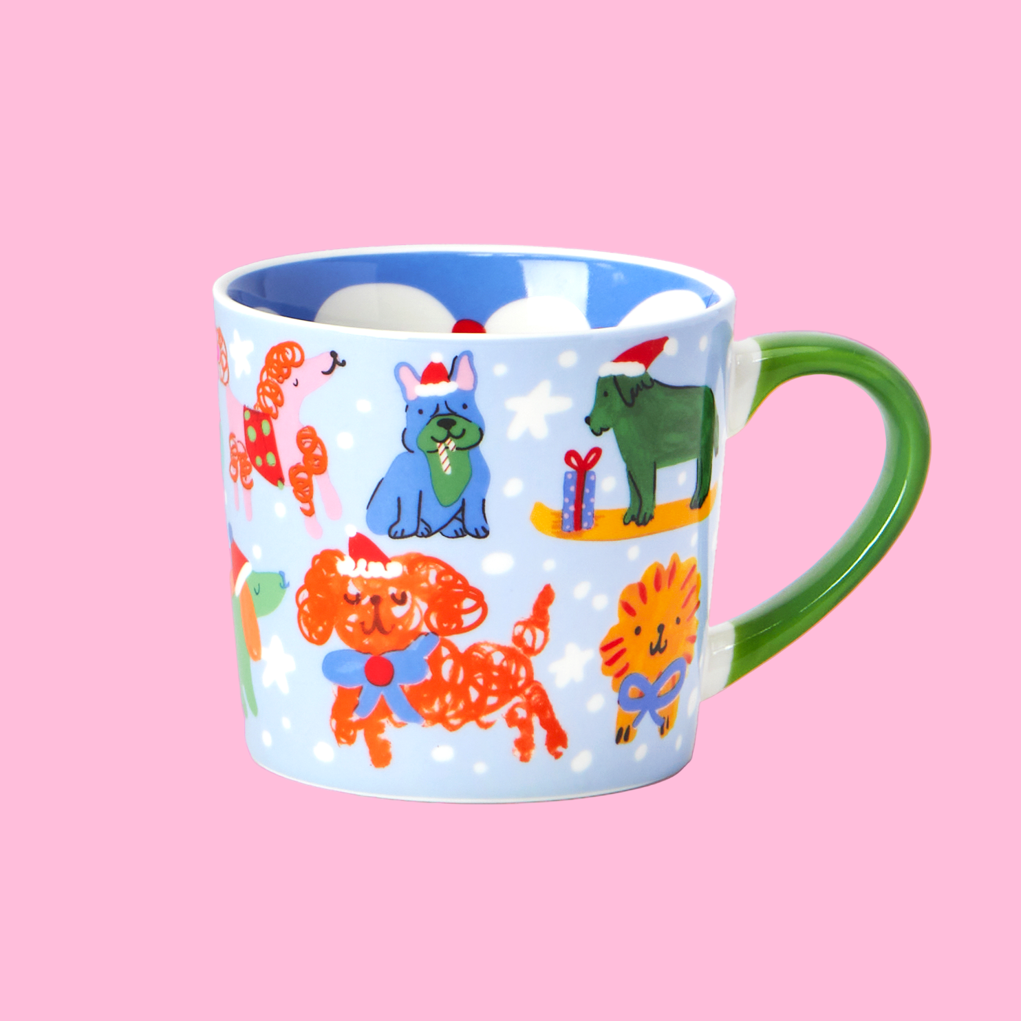 This charming pastel blue mug features festive themed dog illustrations and a snowy design with Christmas illustrations around cute dogs. The contrasting green handle adds a touch of festive cheer. Perfect for anyone who loves dogs and wants to add some Christmas spirit to their morning routine.