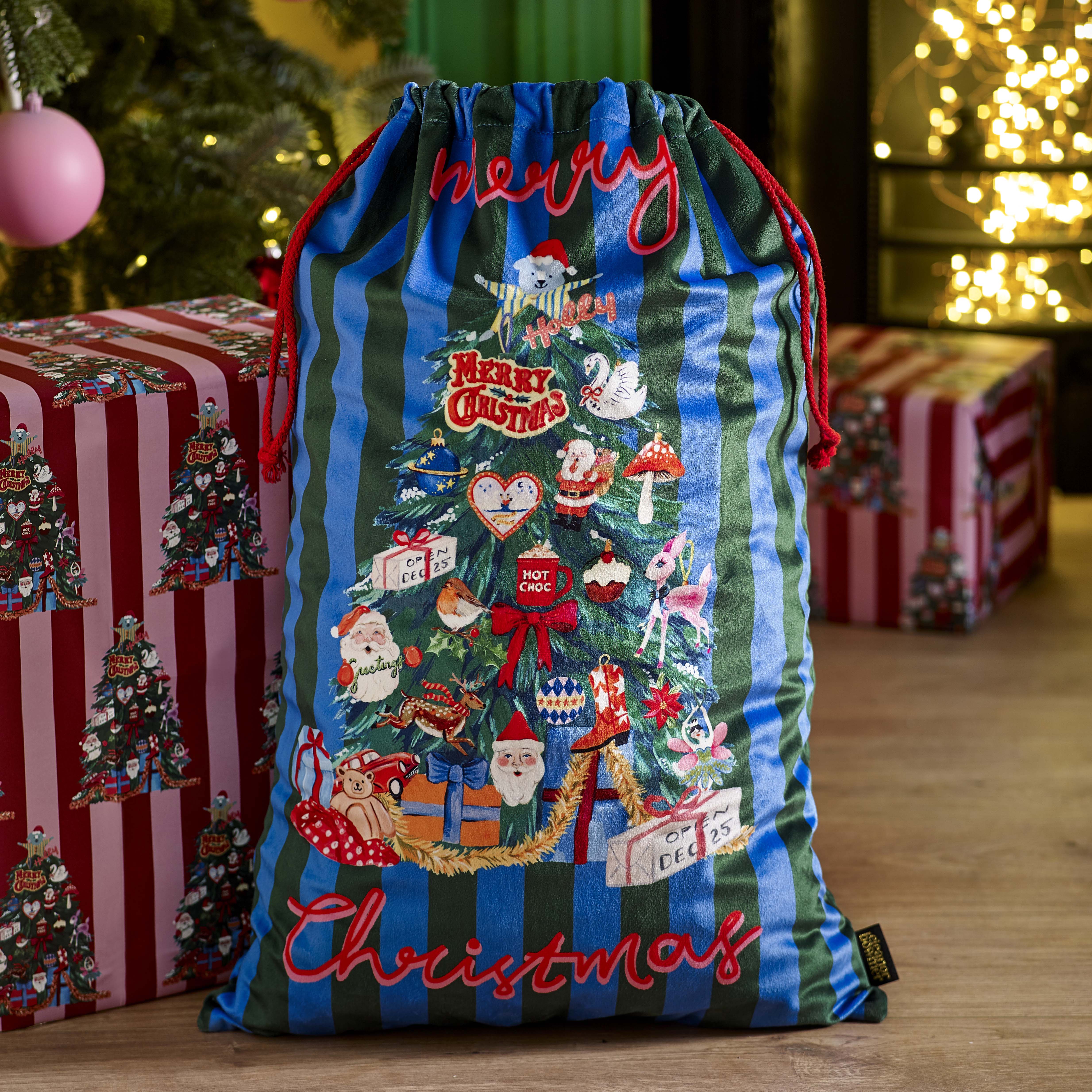A statement sack for standout gifting. Crafted from plush candy stripe velvet in bold blue and green, with a vintage-style Christmas tree and scattered mini trees. Personalise with gold lettering for a luxe, personal touch, or pair with our matching stocking for extra wow factor. Save even more when you buy the Sack & Stocking Set.