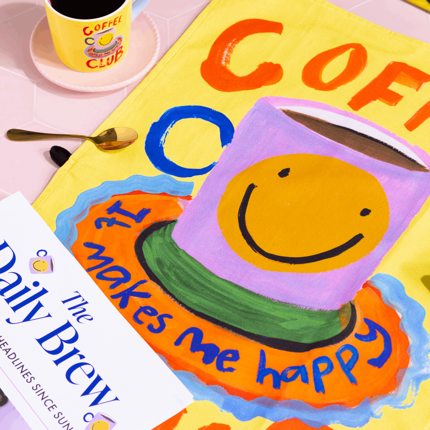 Perk up your kitchen with a little help from the Coffee Club. Featuring a smiley coffee cup and a splash of sunshine yellow, this cheerful tea towel is here to brighten even the dullest dish duty. With its playful design and feel-good vibes, it’s guaranteed to raise a smile one cup at a time. Want the full set-up? Pair it with the matching mug and art print for a coffee corner worth waking up for.