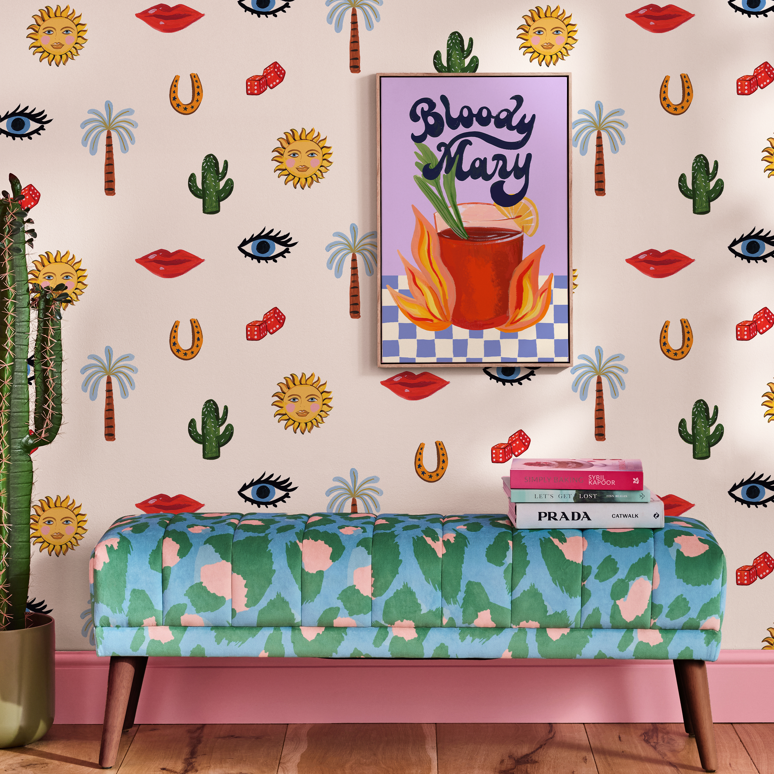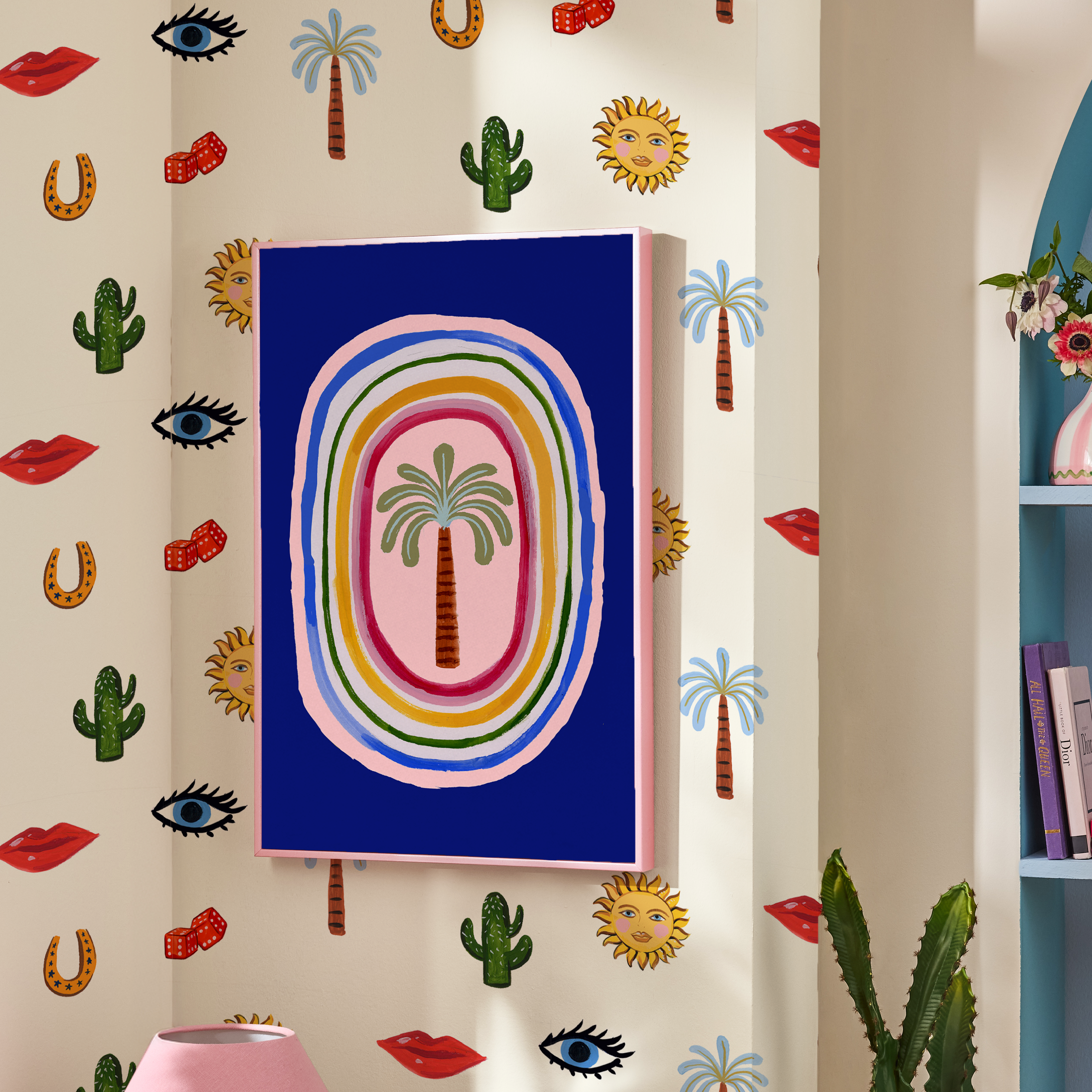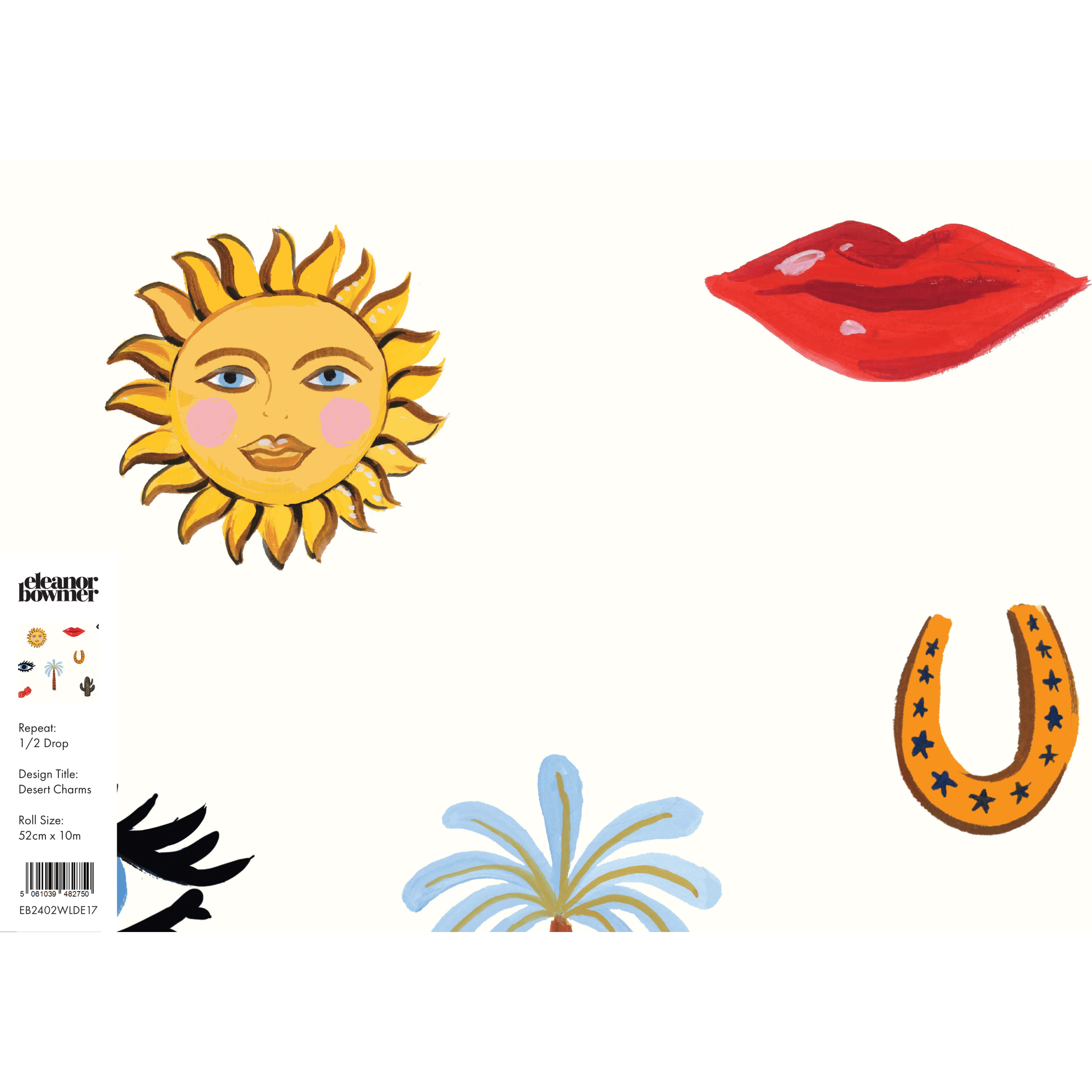 Add a touch of luxury to your home with our Desert Charms Wallpaper. Designed with hand-drawn icons such as lips, palm trees, and the iconic Eleanor Bowmer eye design, this cream wallpaper will make any room feel cool and unique. Pair it with our complimentary accessories for a complete look.