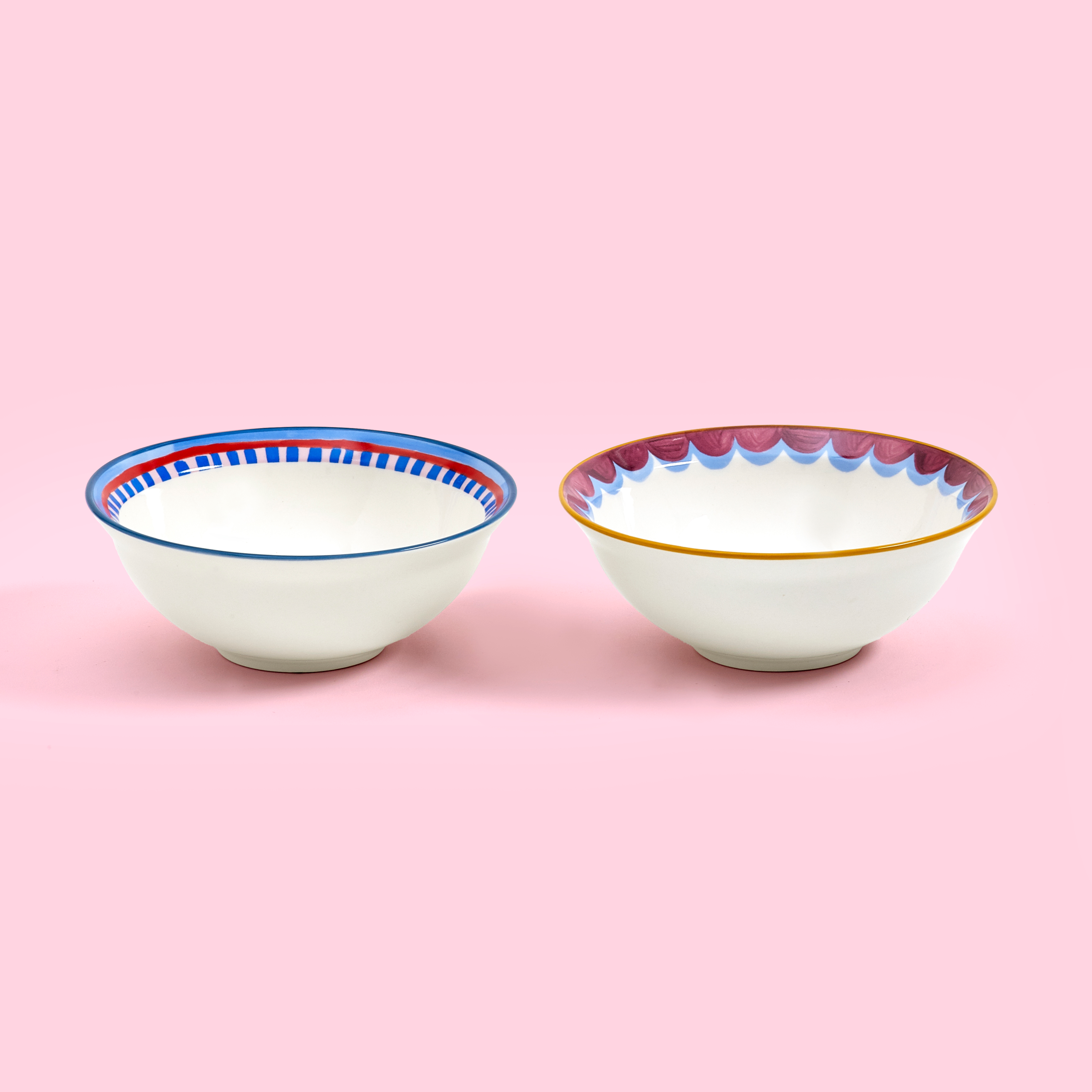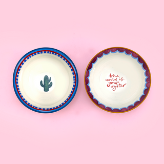 Whether it's olives, nuts or your favourite evening sweet treats, serve them in style with the Electric Coast Set of 2 Nibble Bowls. Part of our Electric Coast collection, these bowls are crafted from stoneware and complete with a hand-illustrated cactus icon and 'The World is Your Oyster' message with colour pop borders. Pair them with the matching Electric Coast tableware range to bring the sunshine to your dining table all-year round.