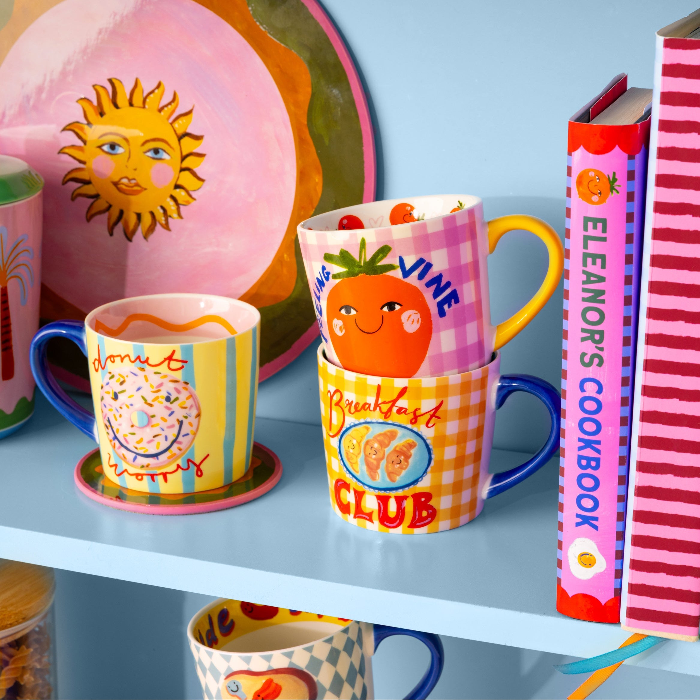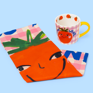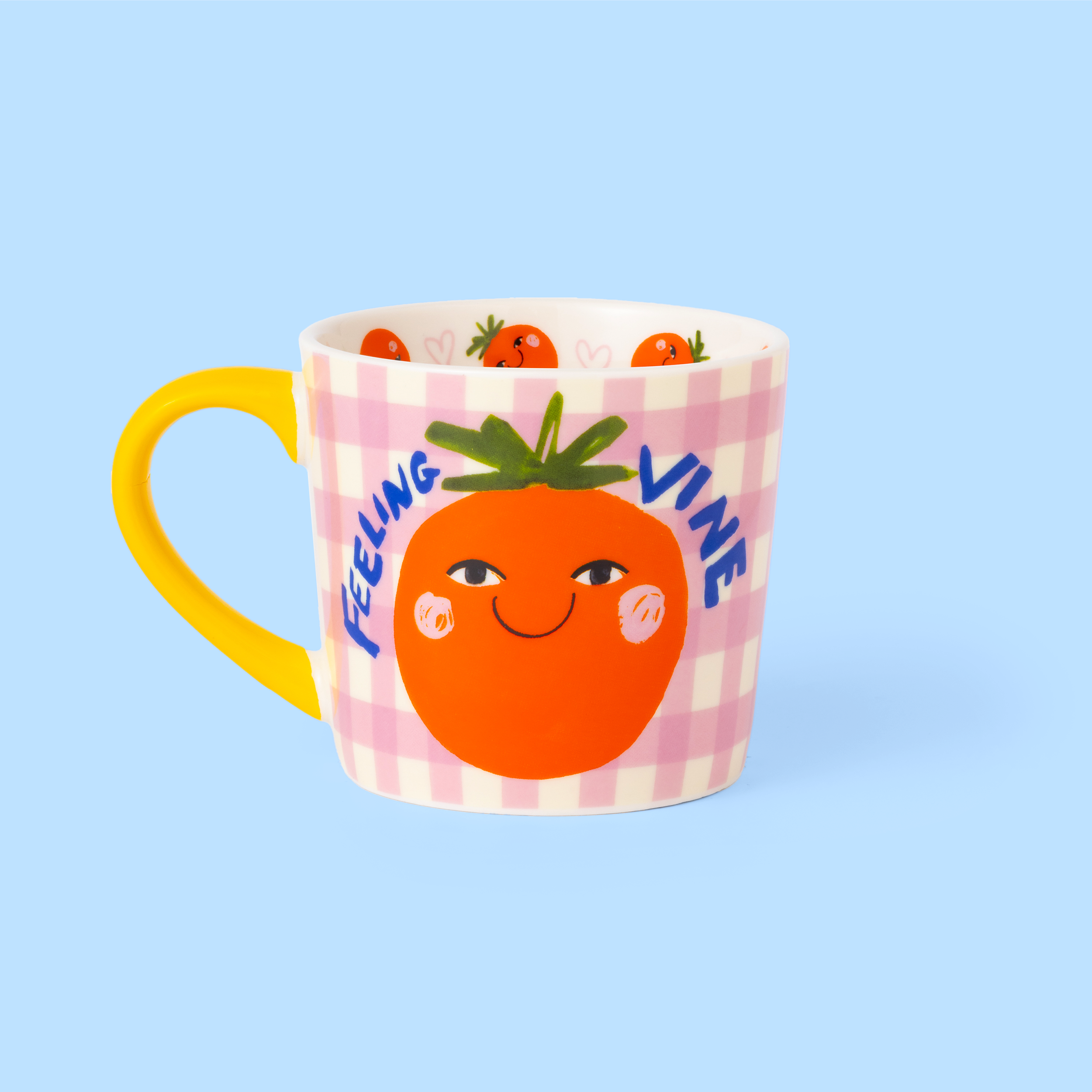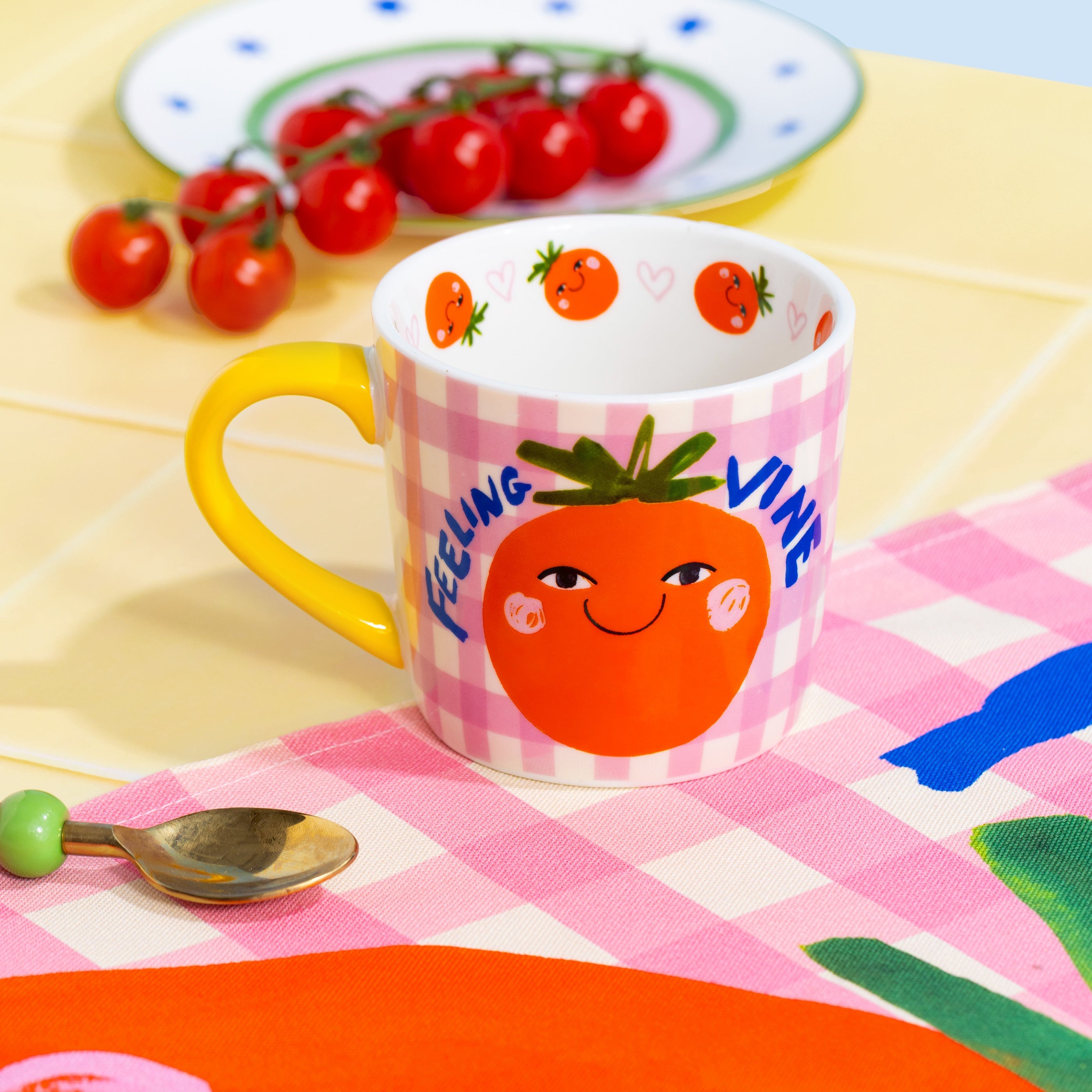 Feeling vine, one sip at a time . This joy-filled mug is here to brighten your brew, featuring a cheeky smiling tomato, playful slogan and pink gingham backdrop. Finished with a bold yellow handle and surprise details inside, it’s made for feel-good mornings, cosy cuppas and adding a splash of personality to your daily routine.