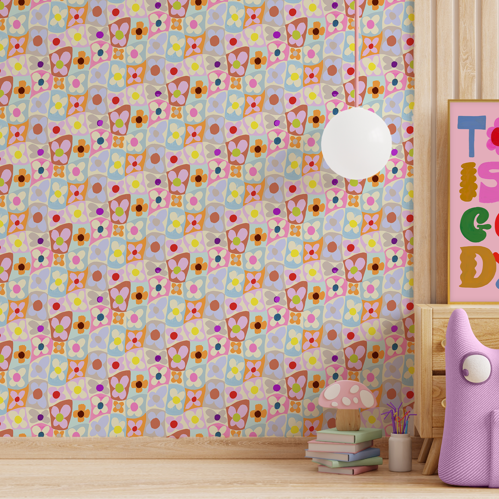 Transform your space with our Flower Power Wallpaper! This retro design features beautiful pastel flowers on a colourful checkerboard background, bringing a touch of luxury to any room. Available in sample sizes and full-sized rolls.