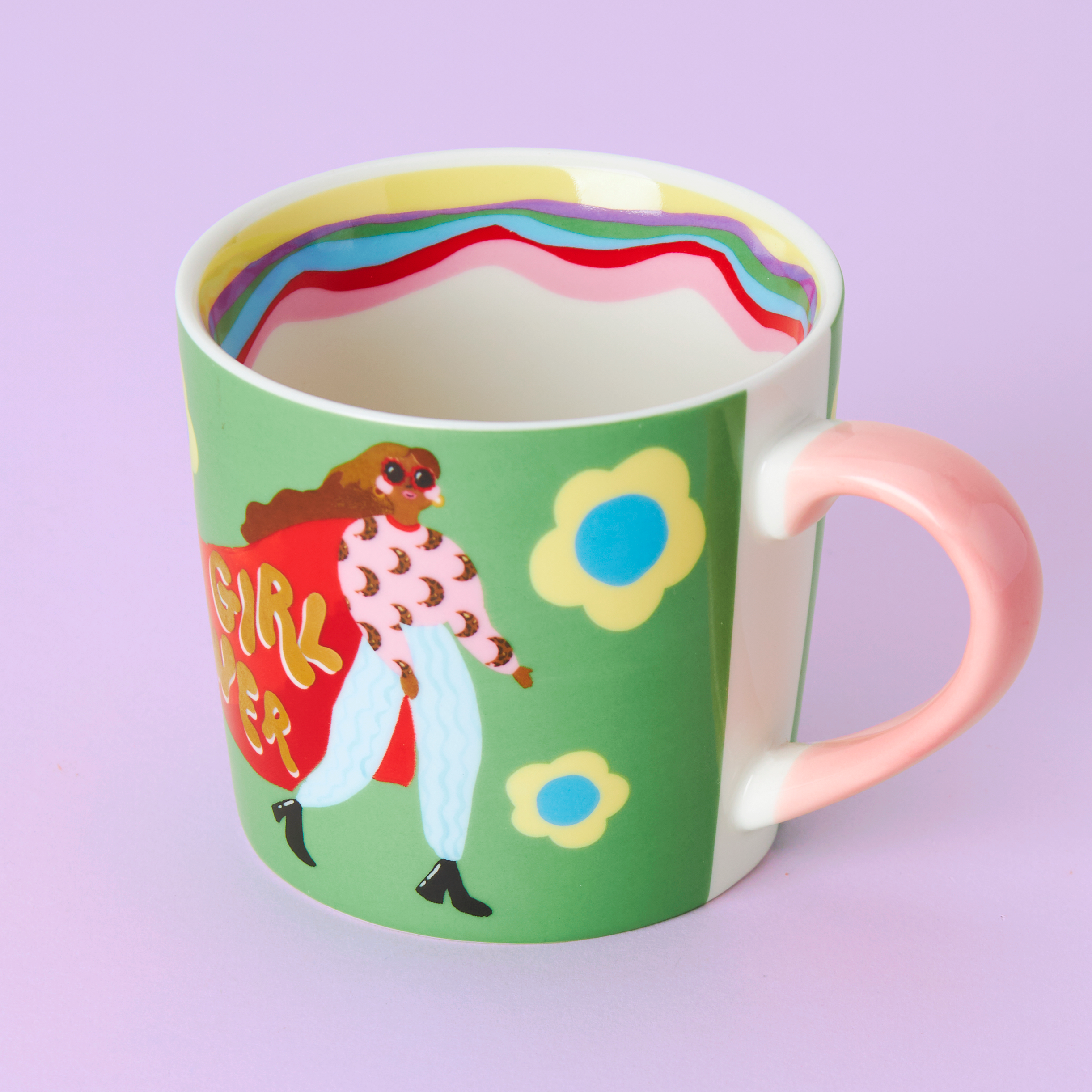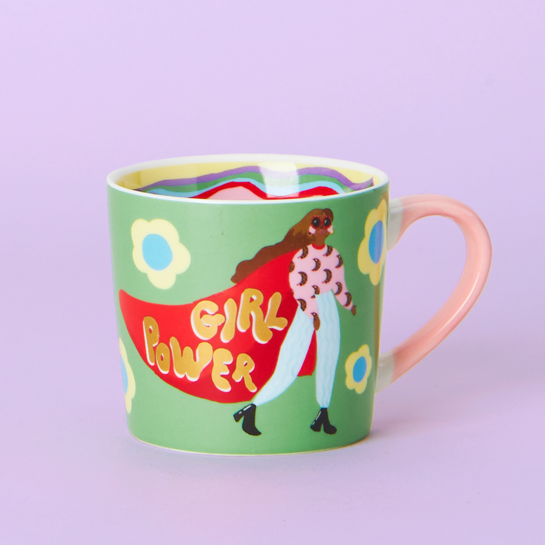 Embrace your strong feminine power with our super hero mug! Adorned with an illustrated woman wearing a cape and the words 'Girl Power' on it, this mug is perfect for empowering mornings. The rainbow wavy pattern inside and cute flower details on the pink handle add a fun touch to your coffee or tea break.