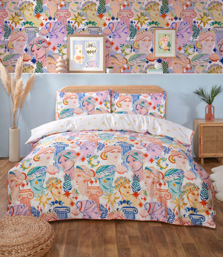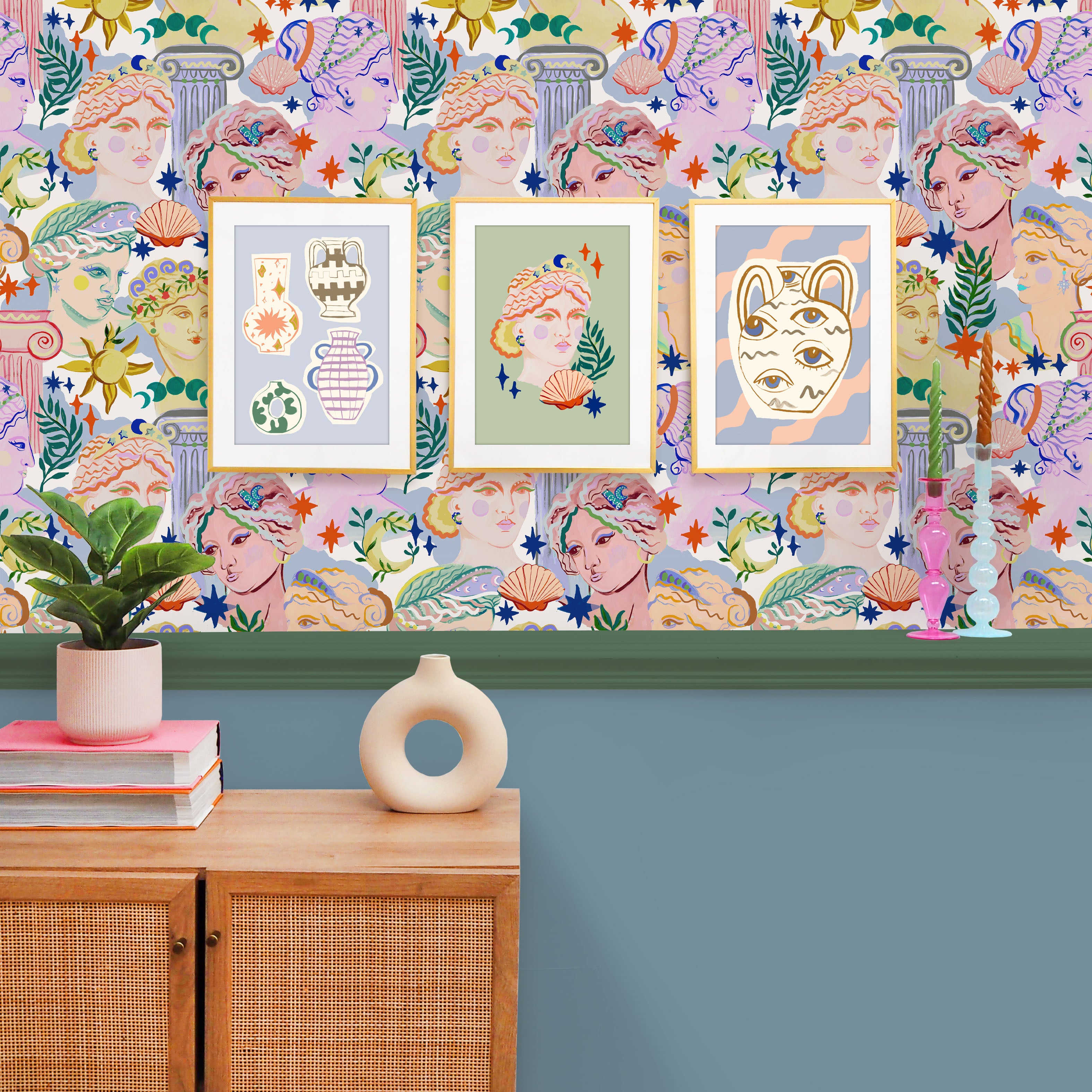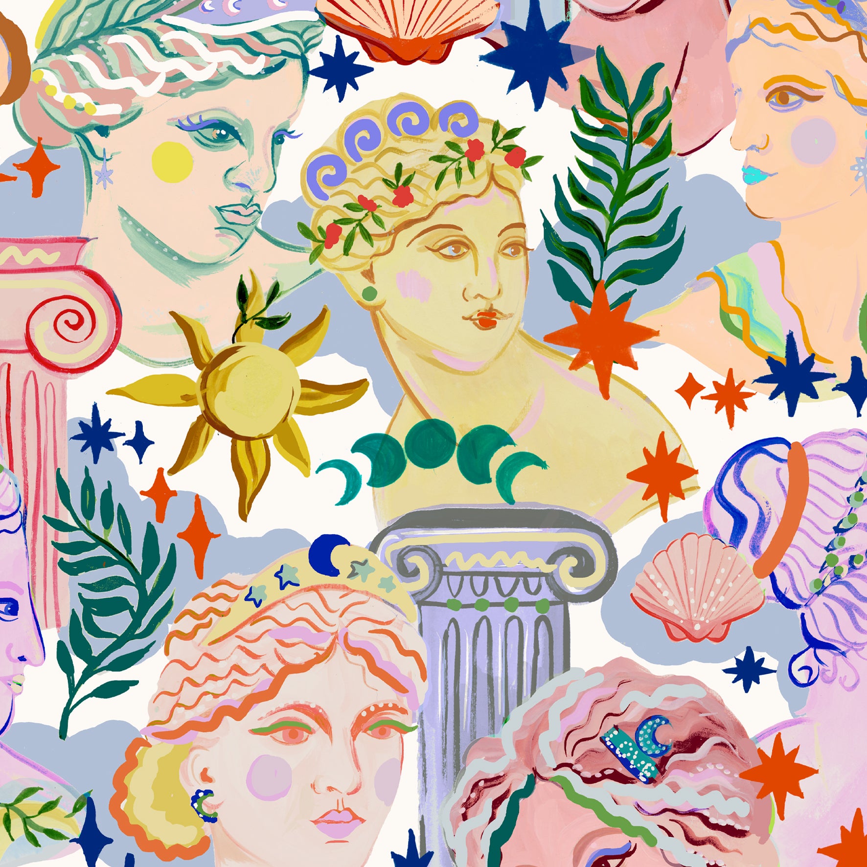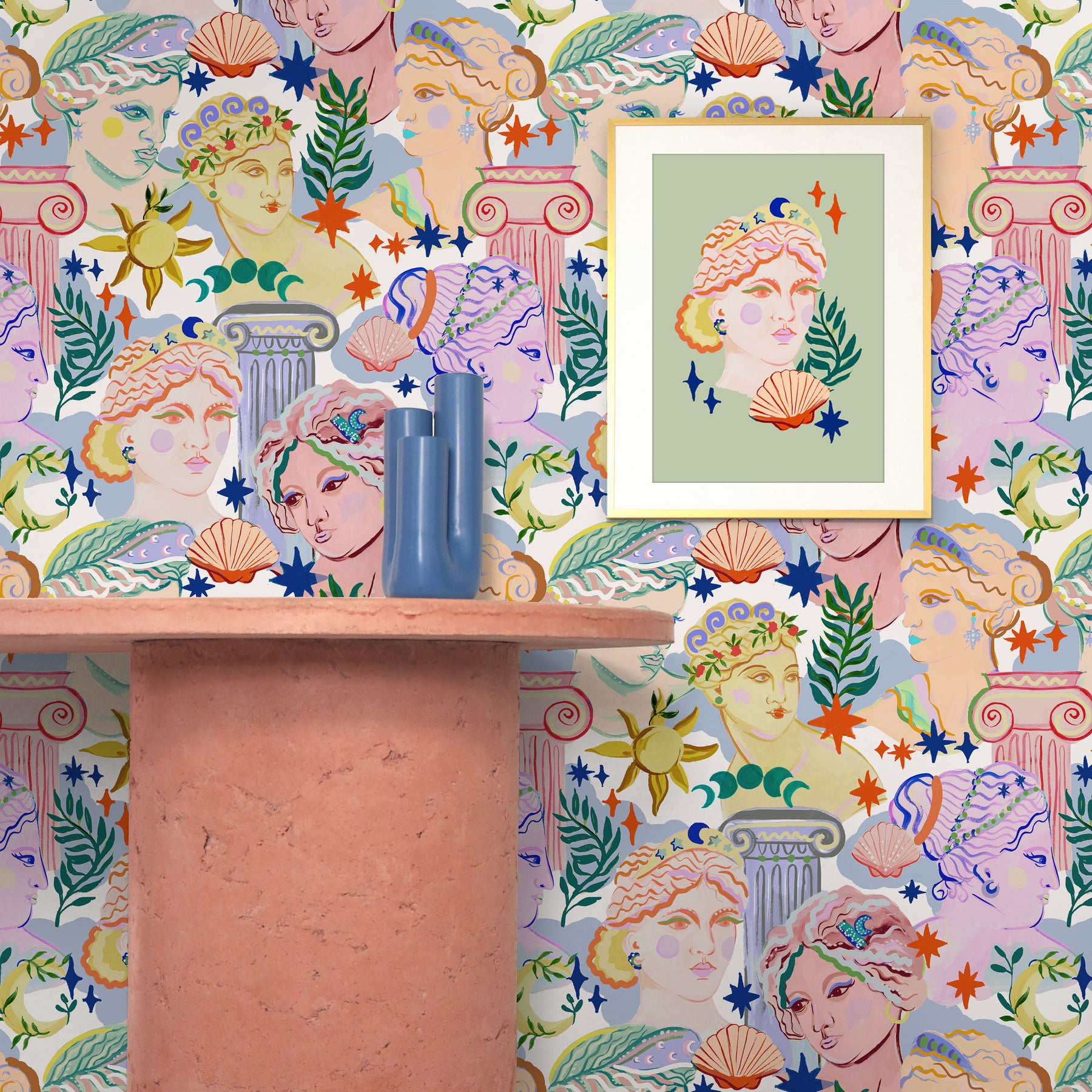 Part of our new 'Mythology’ range of wallpapers. This beautiful design is named ‘Goddess’ which features hand-painted Greek goddess' and unique architecture combined perfectly with an intricate pattern of the ocean and sky.