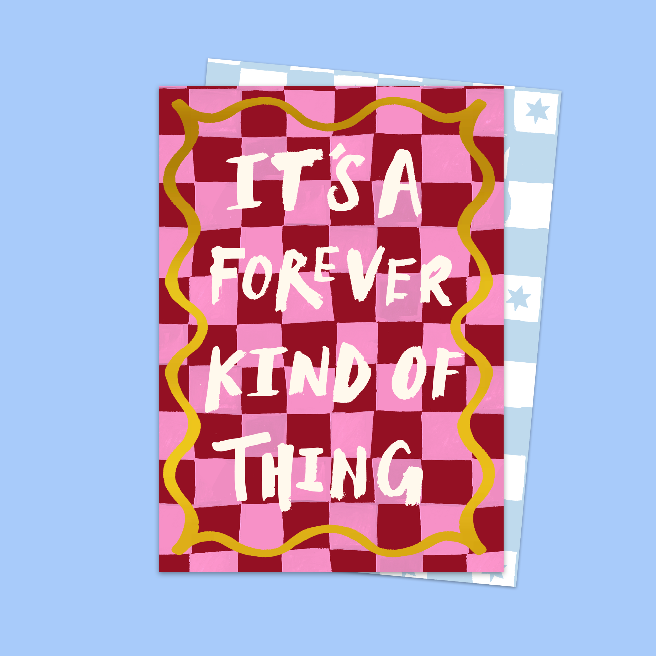 Some love just sticks. Our It’s A Forever Kind of Thing Card pairs a fresh pink and red checkerboard with a squiggly gold frame and sparkling gold foil lettering. Perfect for Valentine’s Day, Galentine’s, or weddings, it’s a bright, feel-good card to celebrate lasting love and friendship in a joyful, heart-warming way.