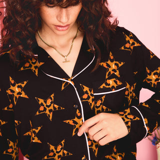 Slip into starry comfort with our black leopard print mule slippers, the perfect partner to your Howdy PJs. With bold star accents and a wild twist on classic cosy, they bring a playful vibe to your wind-down routine. Whether lounging or late-night snacking, these slippers keep it cute, comfy, and full of character.