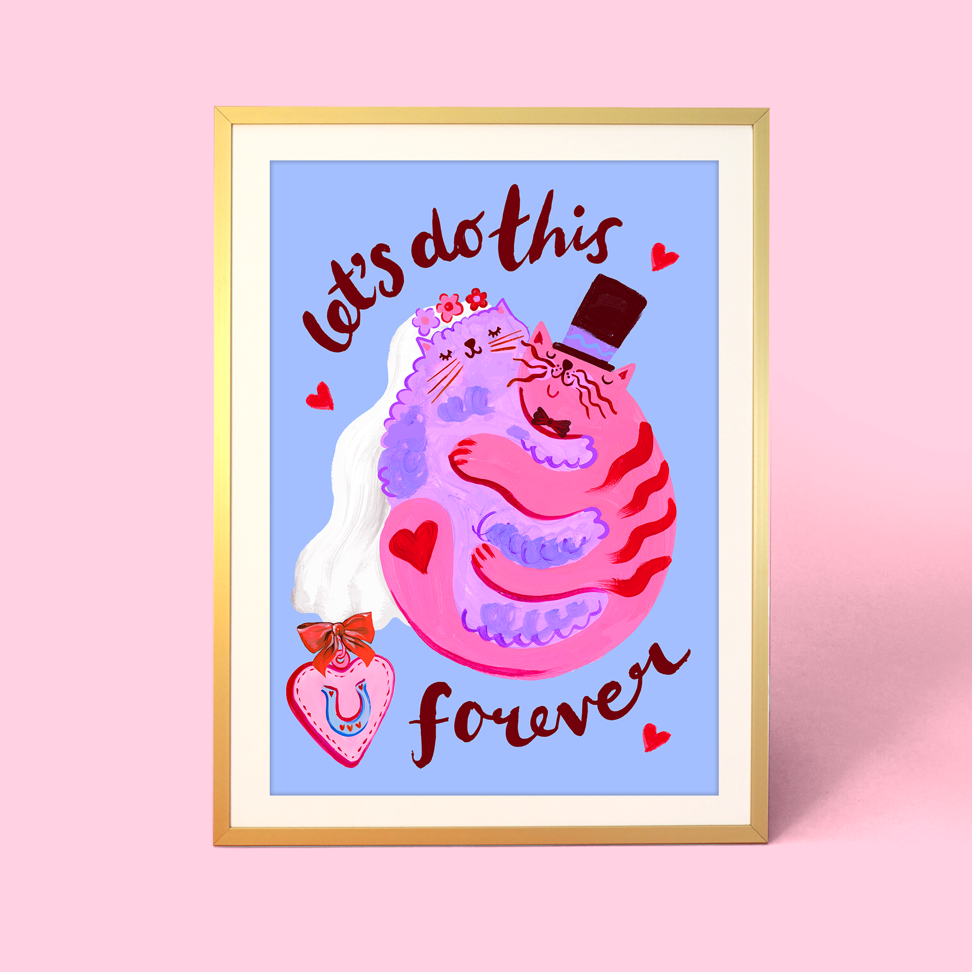 Say “forever” with a touch of whimsy! This print features two cuddly cats - one in a groom’s top hat, the other in a bride’s veil - surrounded by hearts and the words “let’s do this forever.” Personalise with your wedding date for a sweet, quirky keepsake to treasure always.