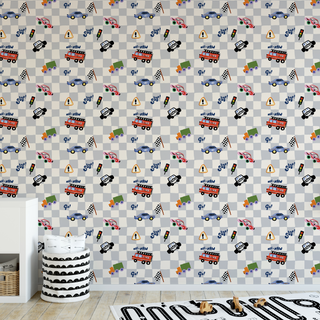 Get your little one's room revved up with our Let's Drive Cars Wallpaper! This grey checkerboard wallpaper features fun illustrations of cars, fire engines, and traffic signs, making it perfect for little one's bedroom. Fuel your kid's love for cars with this playful wallpaper, it's the perfect design if you've been looking for boy's room wallpaper inspiration!