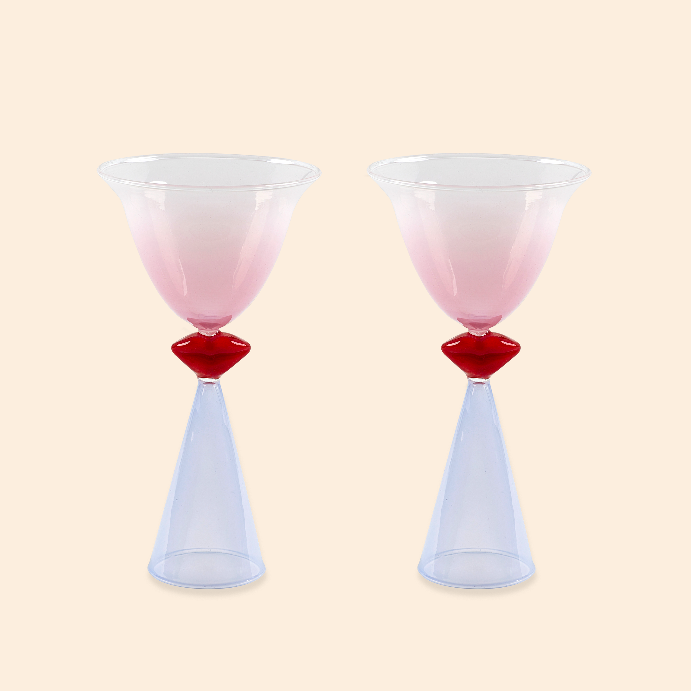 Add glamour to your spritz in our Lips Tinted Cocktail Glasses – a hand-blown, hand-painted set of two with ombre pink and blue and a pop of red lips on each stem. Beautifully boxed for gorgeous gifting, these statement glasses are made to impress, whether you're mixing martinis or dressing up your drinks trolley. A flirty little upgrade for cocktail hour, and a perfect match to our Lips Wine Glasses.