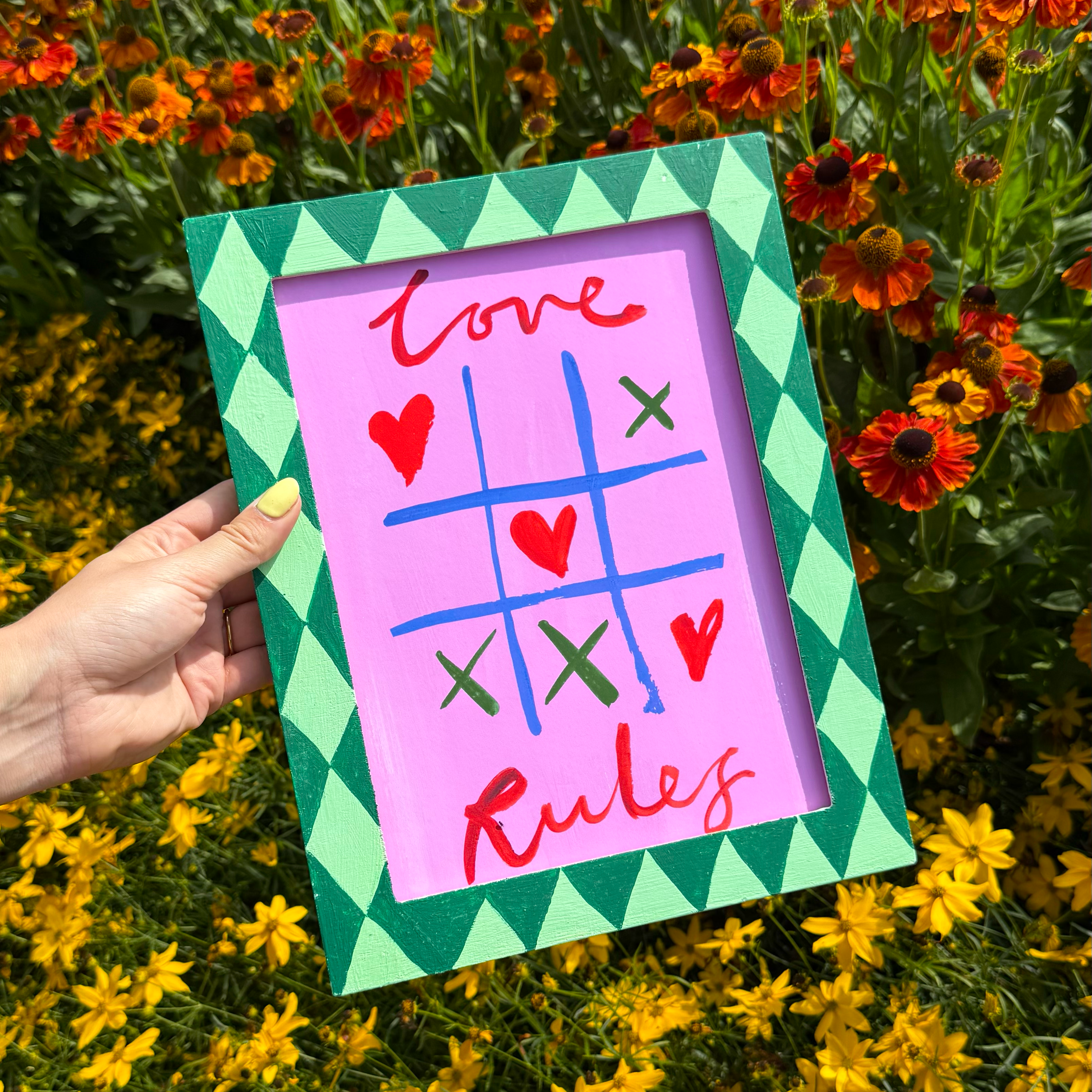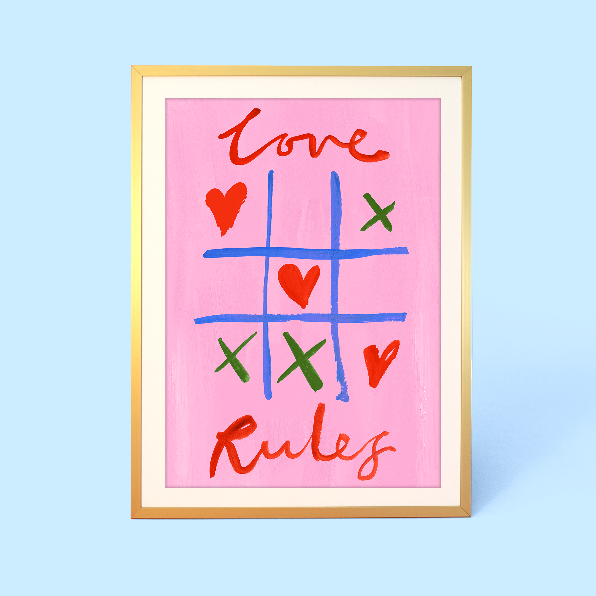 Spread the love! Our Love Rules Hearts & Crosses print features a pink background with red handwritten lettering and sweet noughts & crosses doodle. A charming gift for weddings, engagements or Valentine’s Day, because love always wins.