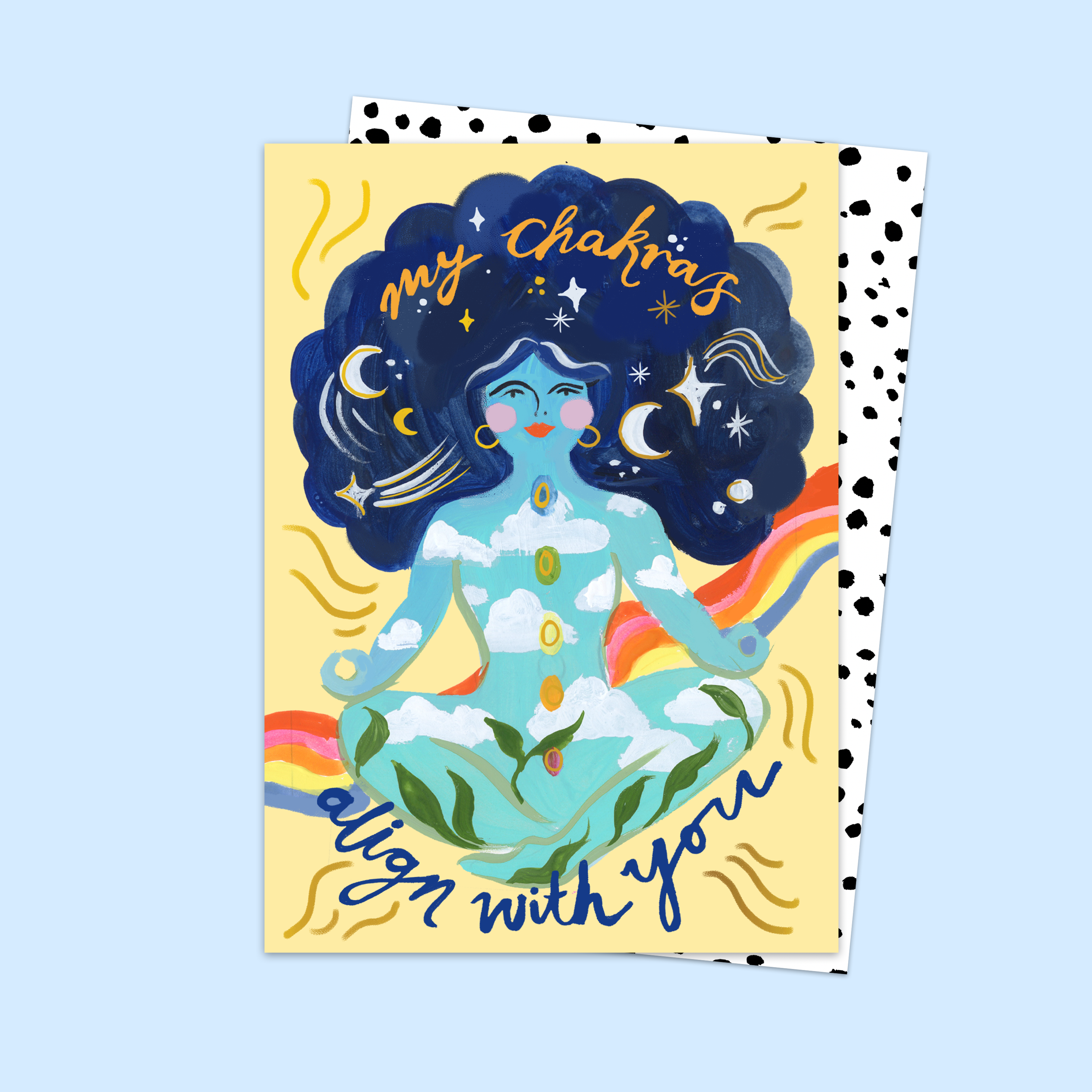 This 'My Chakras Align With You' card is perfect for sending to a loved one to express your support and connection. Featuring a vibrant woman illustration and zen elements, this card also has rainbow and gold foil detailing for an extra special touch. Perfect as a birthday card or just to send your love.