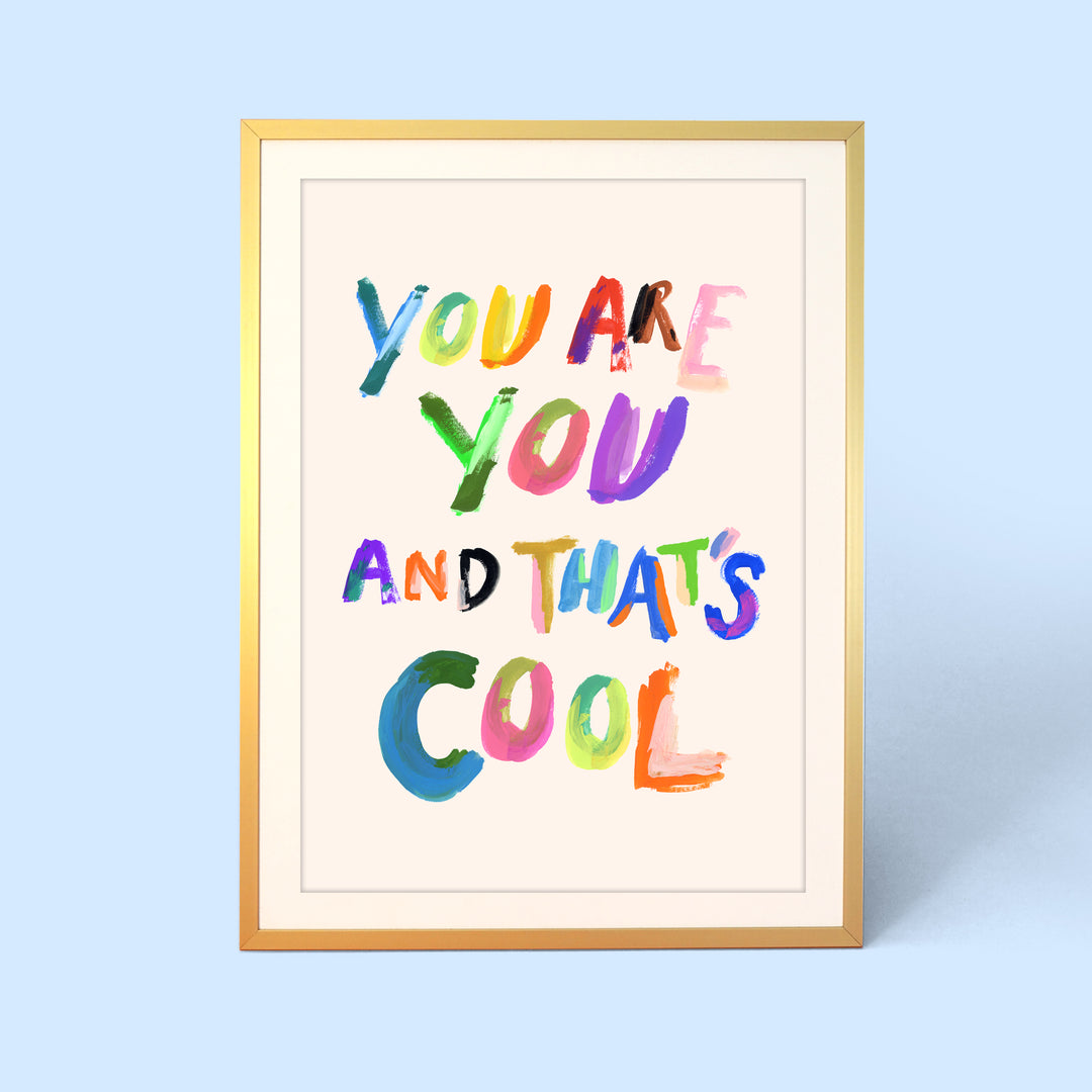 Featuring hand-painted typography in a variety of vibrant colours, the message "You Are You And That's Cool" serves as a powerful daily affirmation for kids and adults alike. It's a gentle reminder to embrace and love oneself, just the way they are.